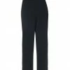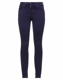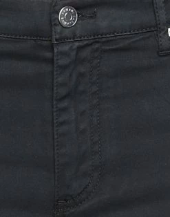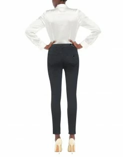 plain weave, solid color, leather applications, brand logo, mid rise, slim-leg pants, tapered leg, zipper closure, five pockets, stretch, contains non-textile parts of animal origin
