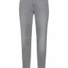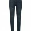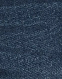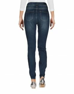 denim, faded, logo, solid color, medium wash, high waisted, front closure, button, zip, multipockets, stretch