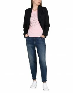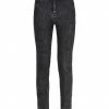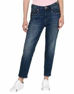 denim, faded, logo, studs, solid color, dark wash, mid rise, front closure, button, zip, multipockets, stretch, contains non-textile parts of animal origin
