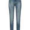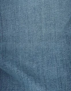 denim, faded, leather applications, logo, solid color, dark wash, mid rise, front closure, button, zip, multipockets, contains non-textile parts of animal origin, stretch