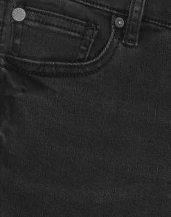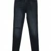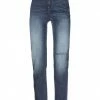 denim, faded, metal applications, brand logo, solid color, mid rise, tapered leg, slim-leg pants, 1 button, zipper closure, side slit hemline, five pockets, stretch, colored wash