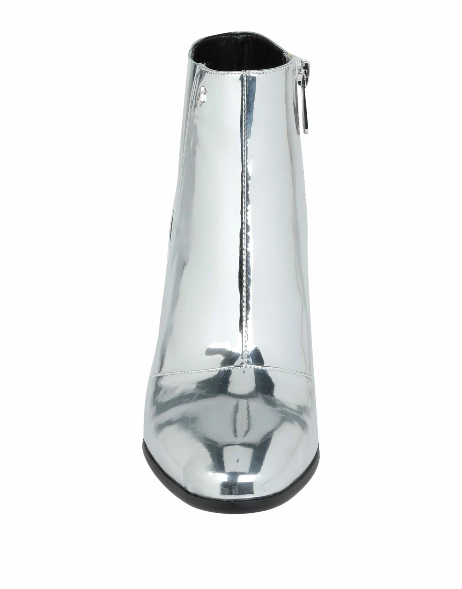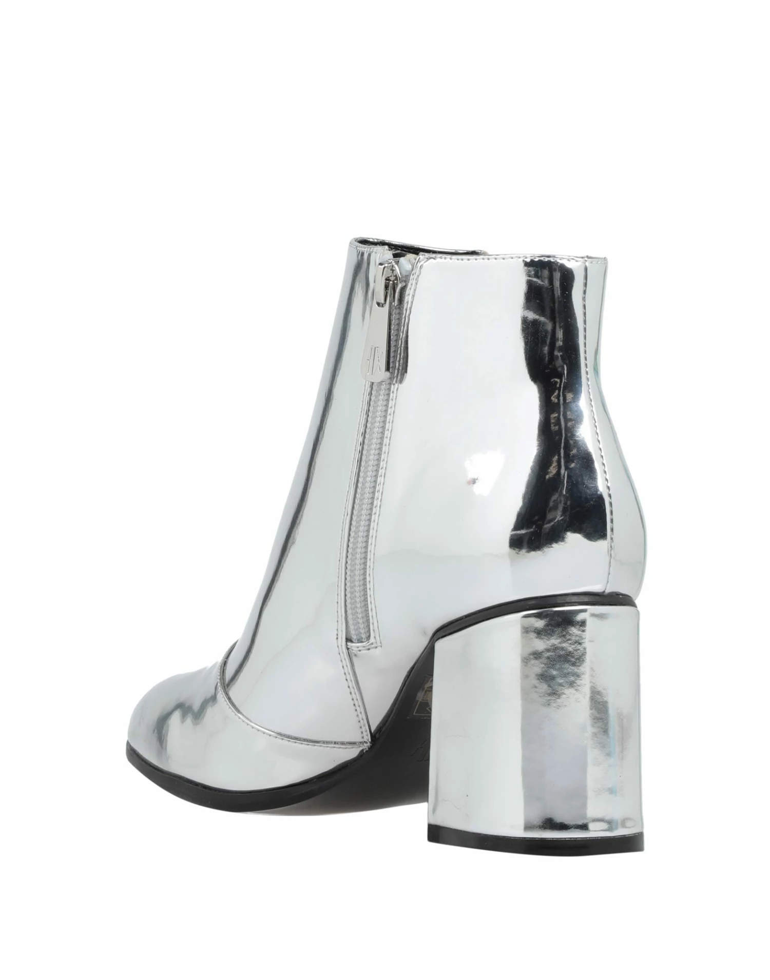 laminated effect, logo, solid color, zipper closure, narrow toeline, square heel, covered heel, fully lined, rubber sole