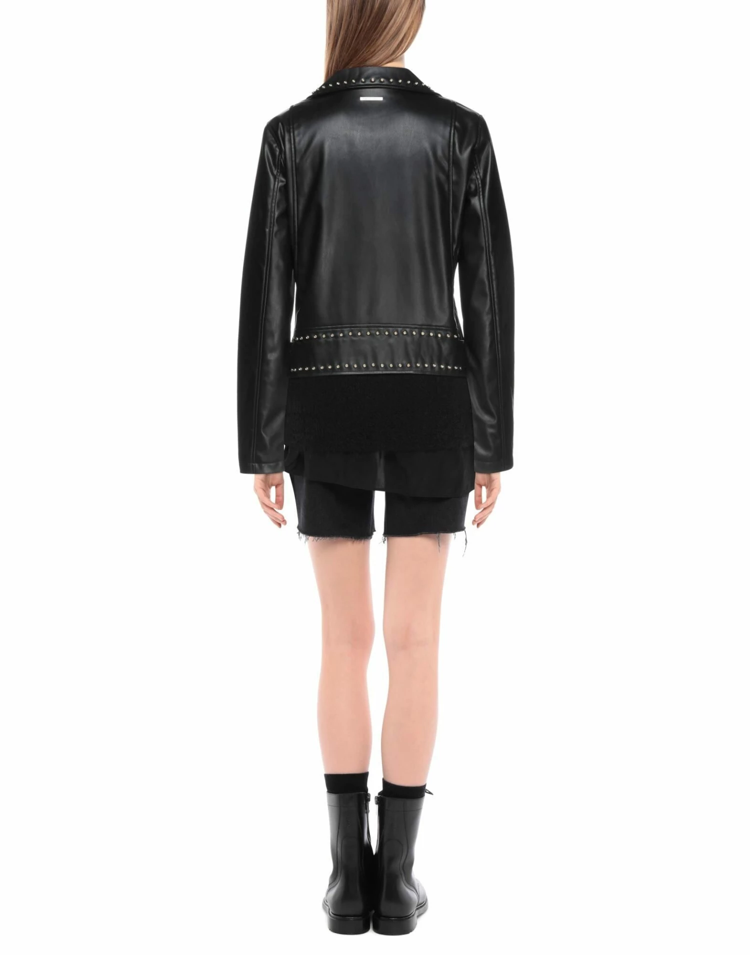 coated fabric, belt, studs, solid color, single-breasted , lapel collar, long sleeves, snap buttons fastening, multipockets, fully lined
