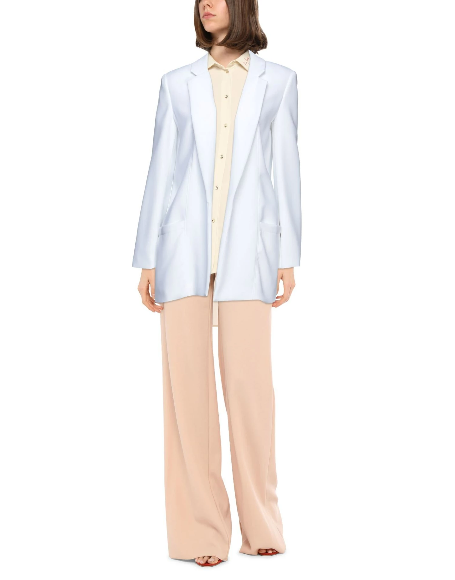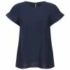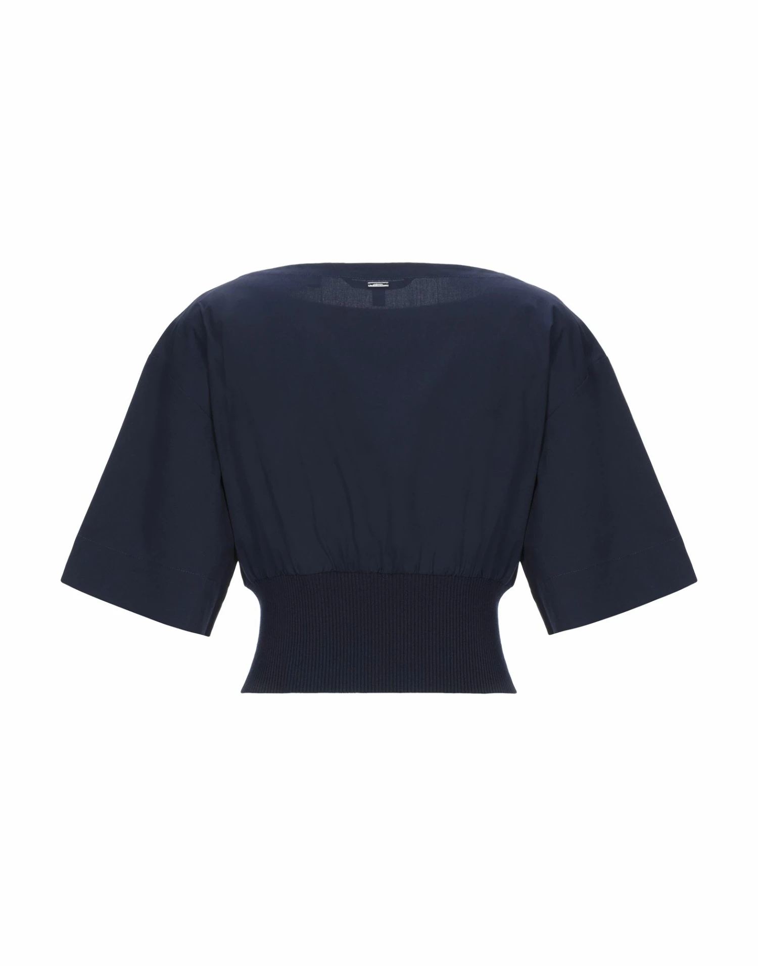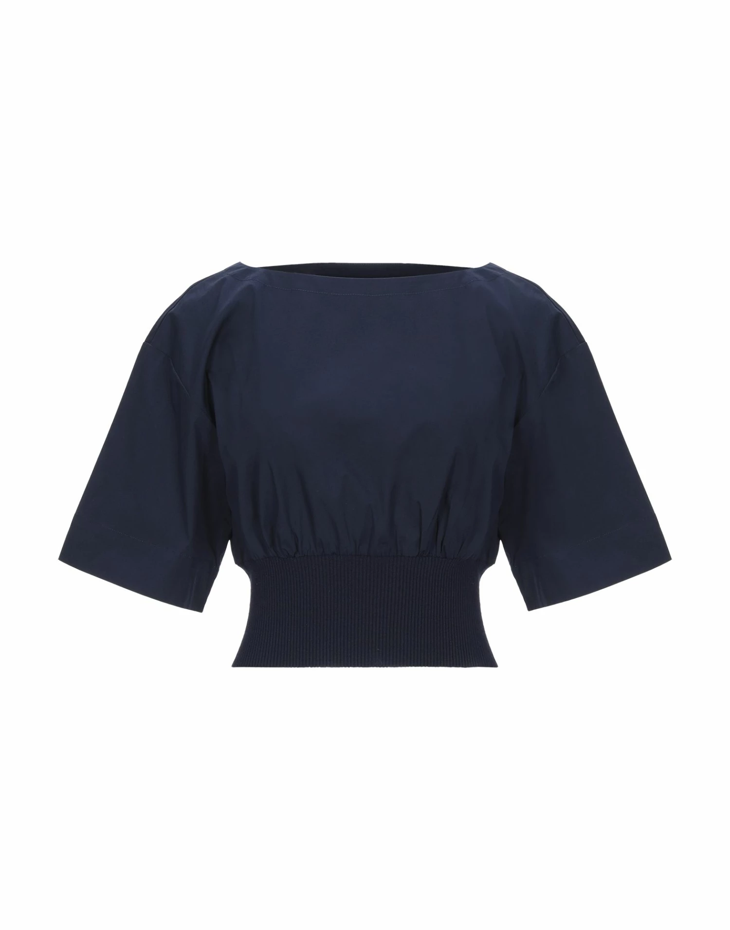 plain weave, no appliqués, basic solid color, 3/4 length sleeves, no pockets, wide neckline, stretch, with elastic bottom