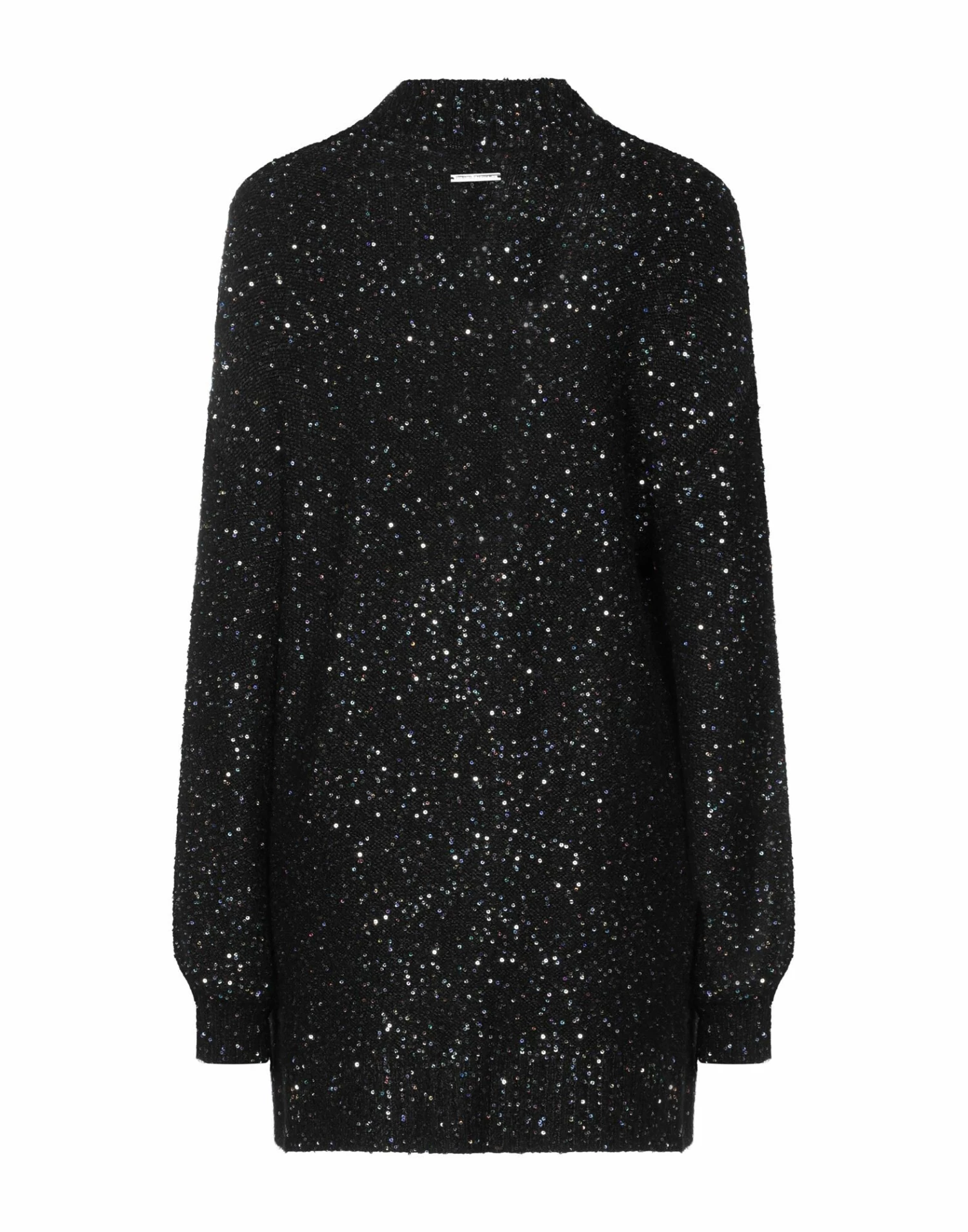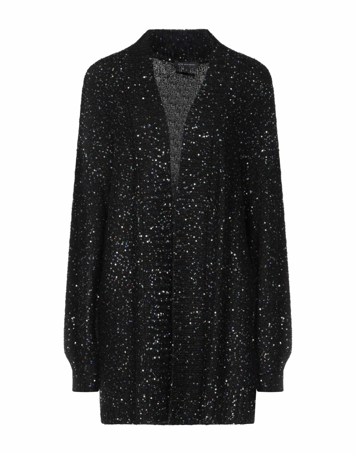 knitted, sequins, logo, lightweight knit, deep neckline, solid color, long sleeves, multipockets, stretch