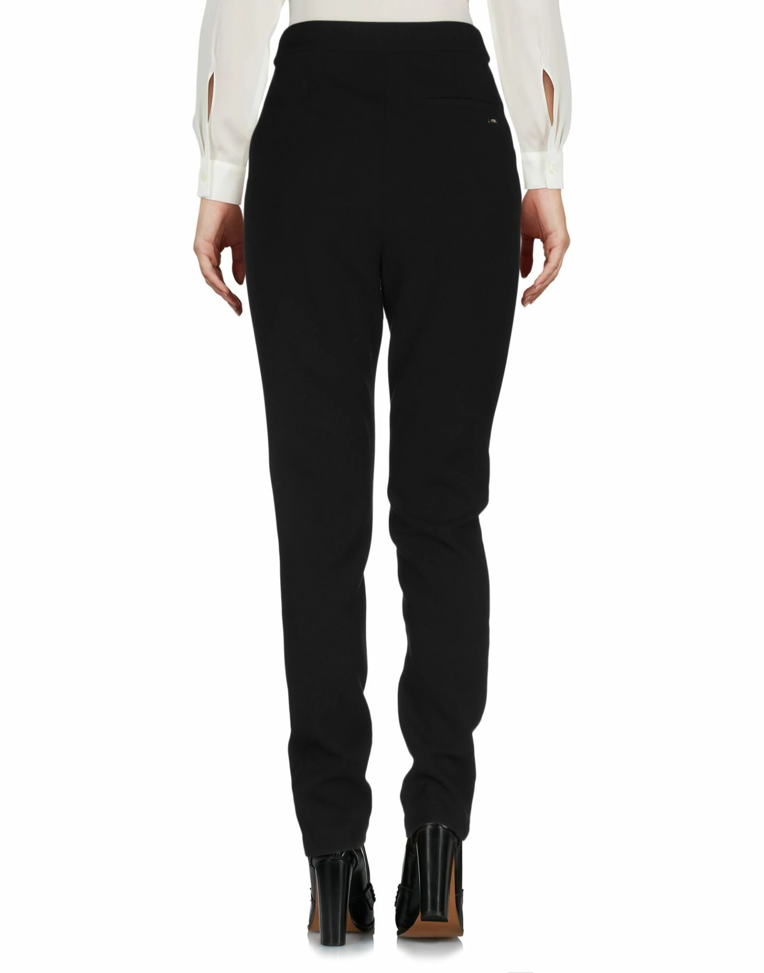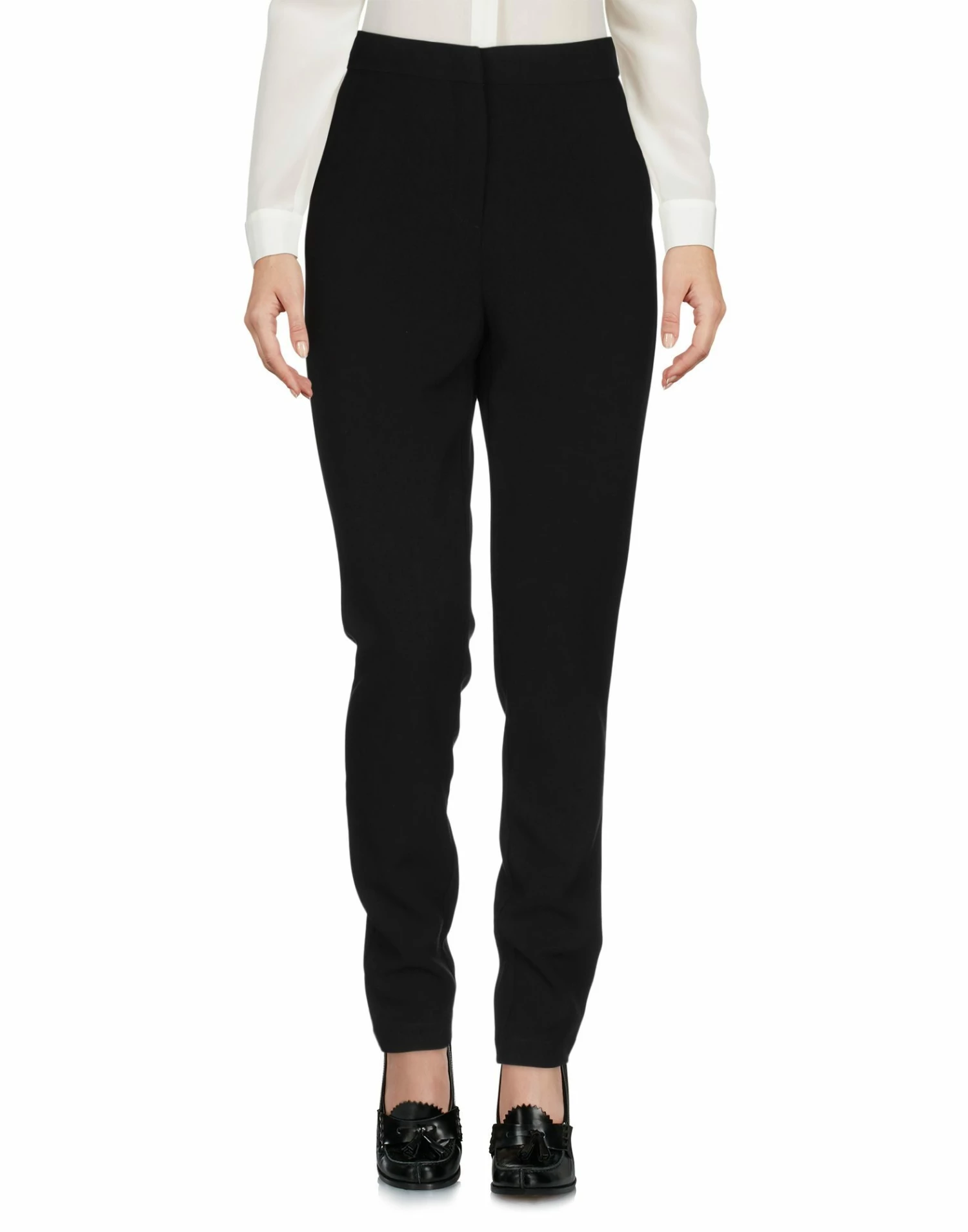crepe, solid color, logo, mid rise, regular fit, tapered leg, hook-and-bar, zip, multipockets, stretch