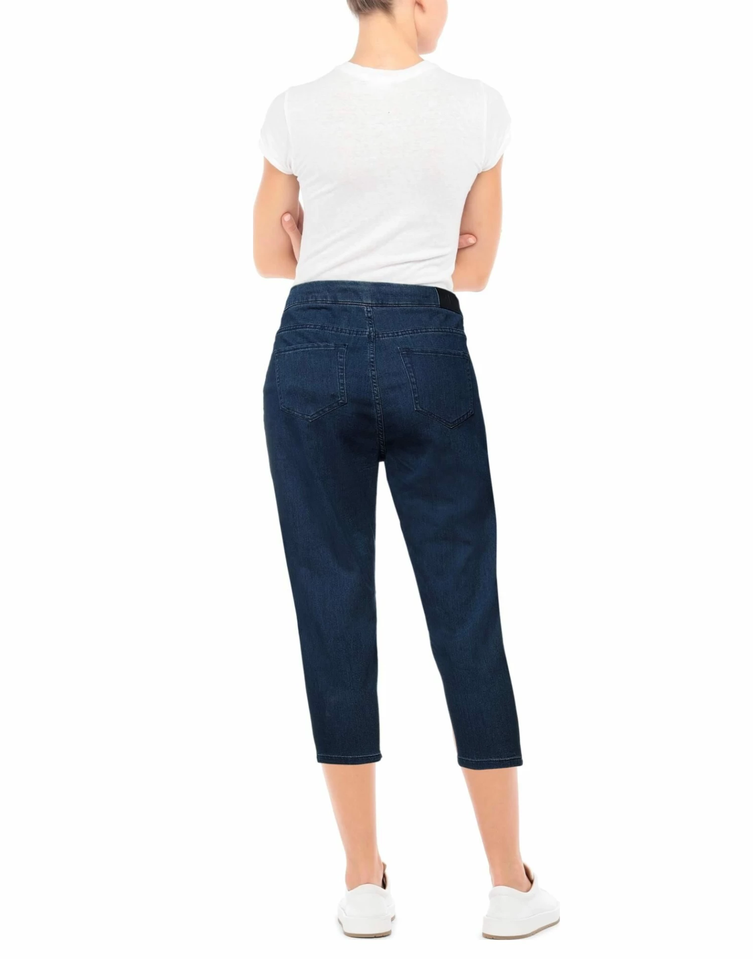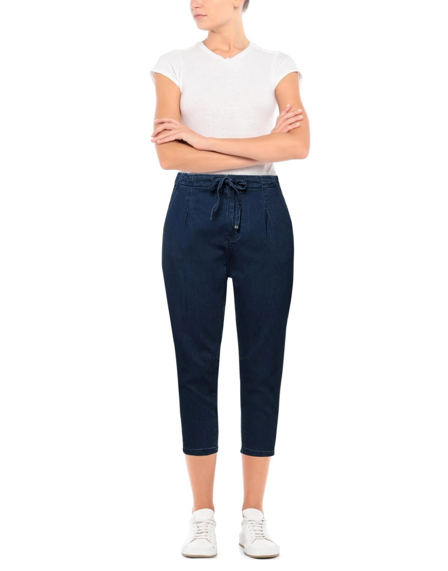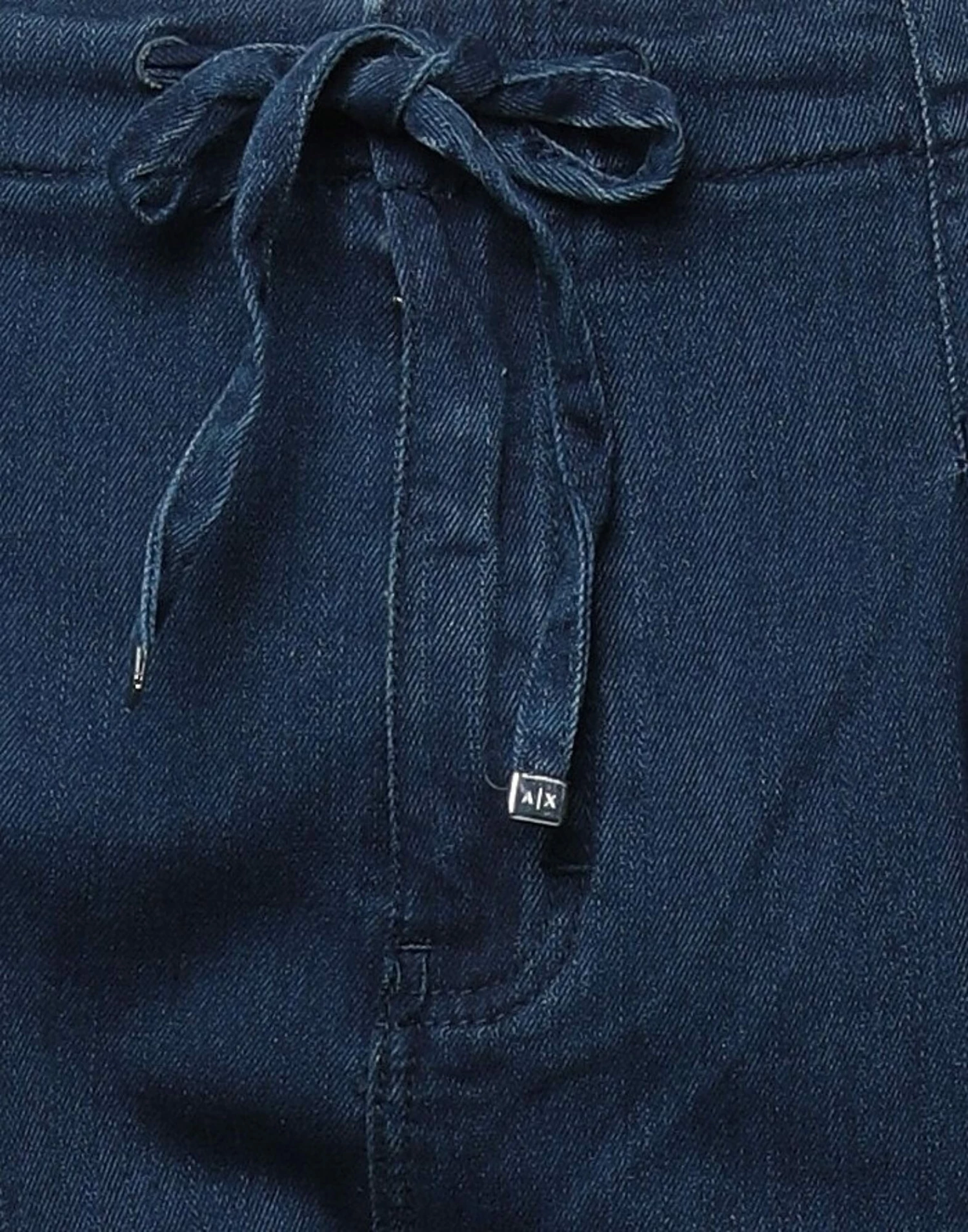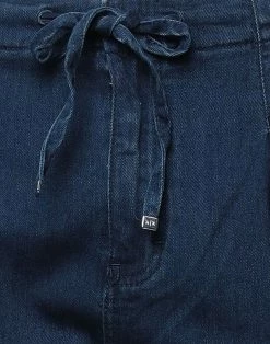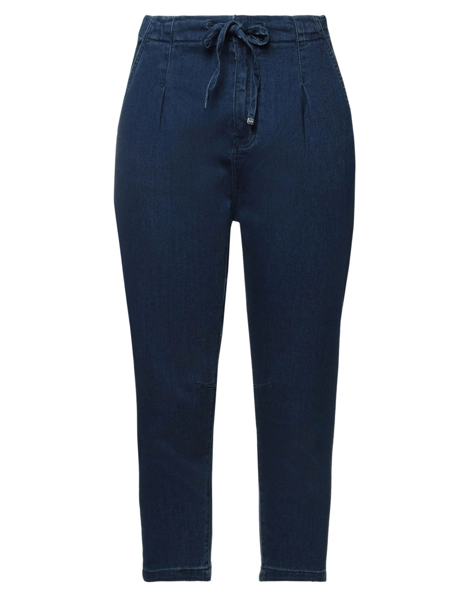 denim, dark wash, contrasting applications, brand logo, high waisted, solid color, regular fit, tapered leg, hook-and-eye closure, multipockets, stretch