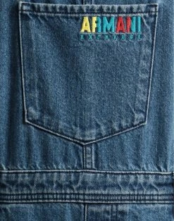 denim, embroidered detailing, brand logo, solid colour with appliqués, overalls top, sleeveless, button closing, multipockets, belt loops