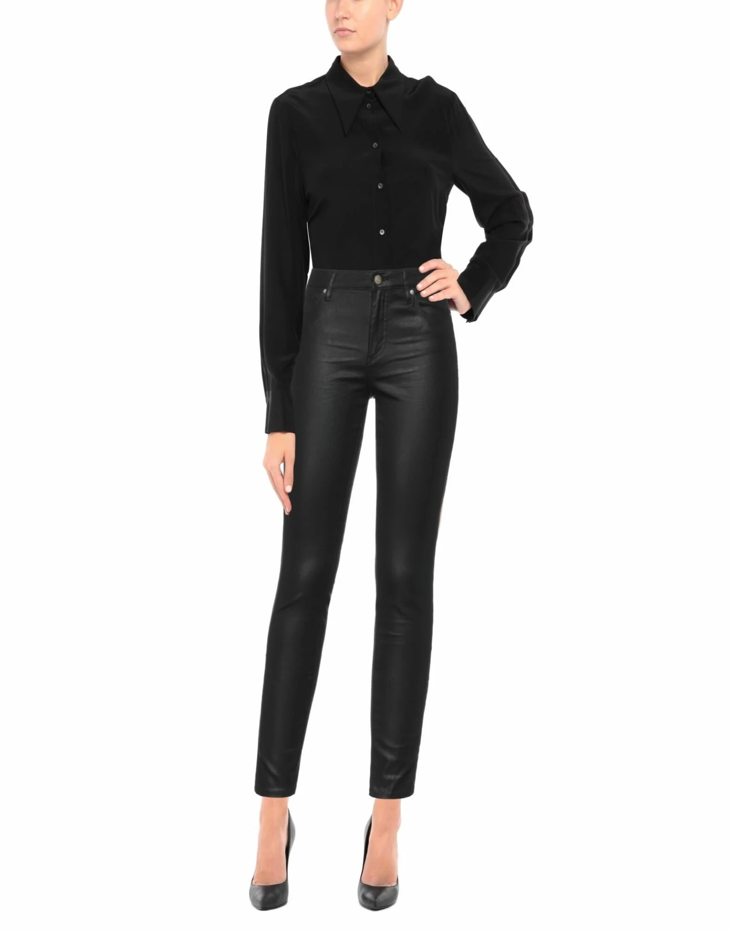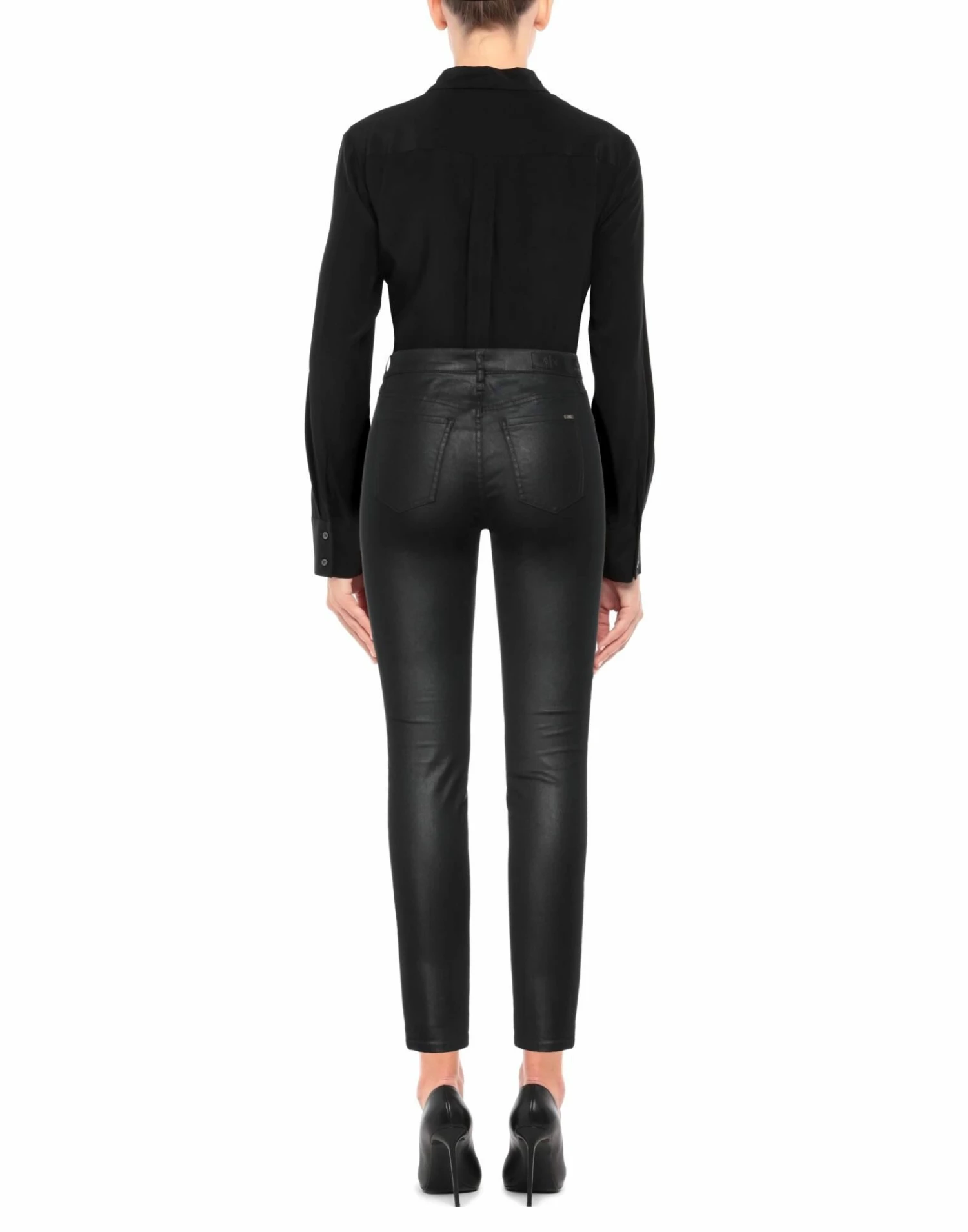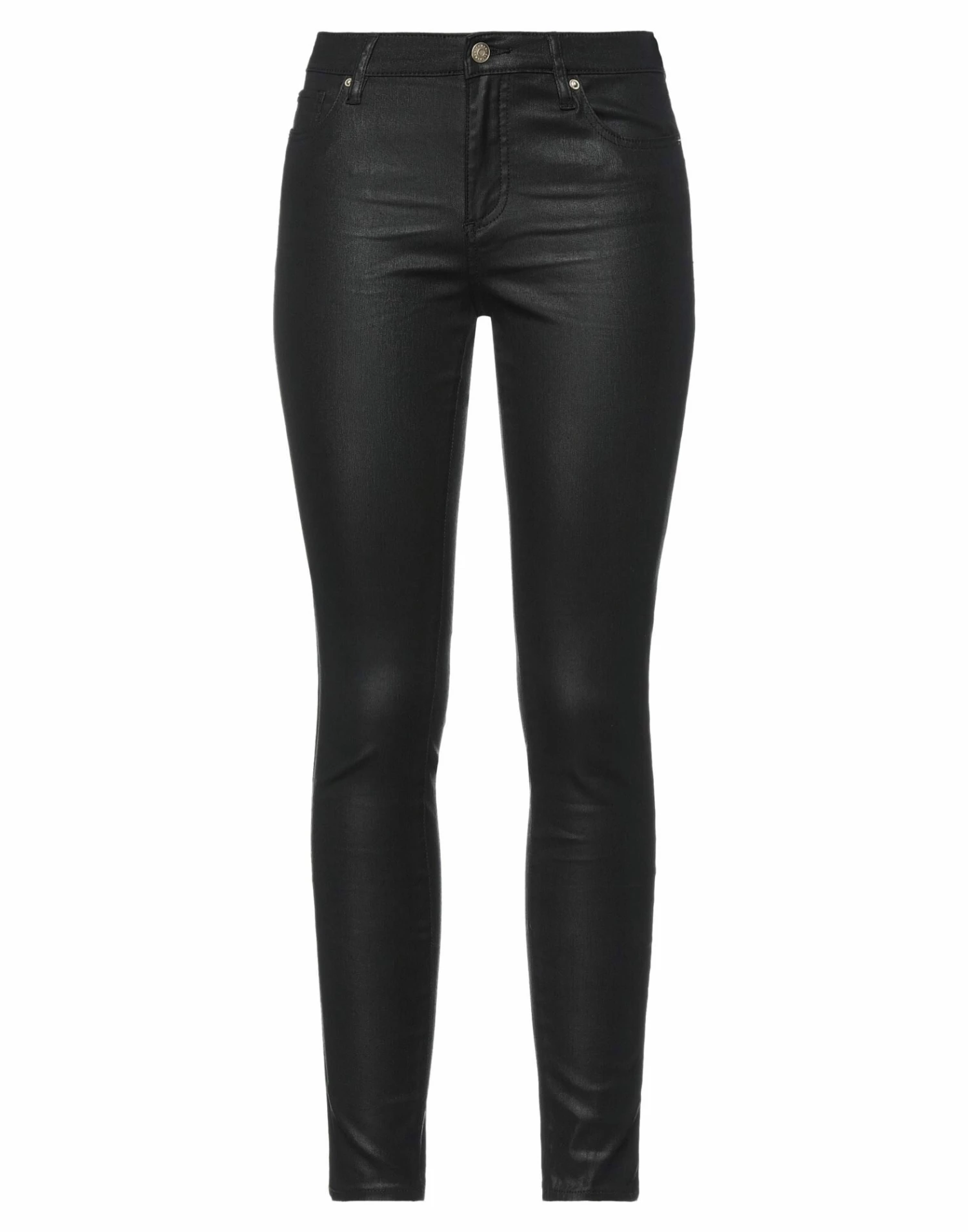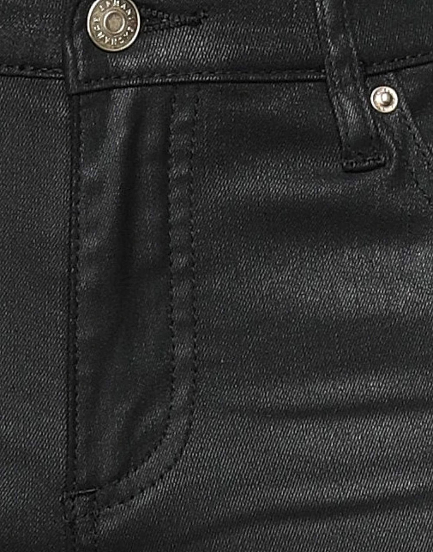 denim, coated effect, brand logo, mid rise, solid color, slim-leg pants, tapered leg, 1 button, zipper closure, multipockets, stretch, colored wash