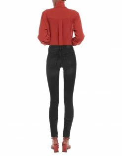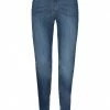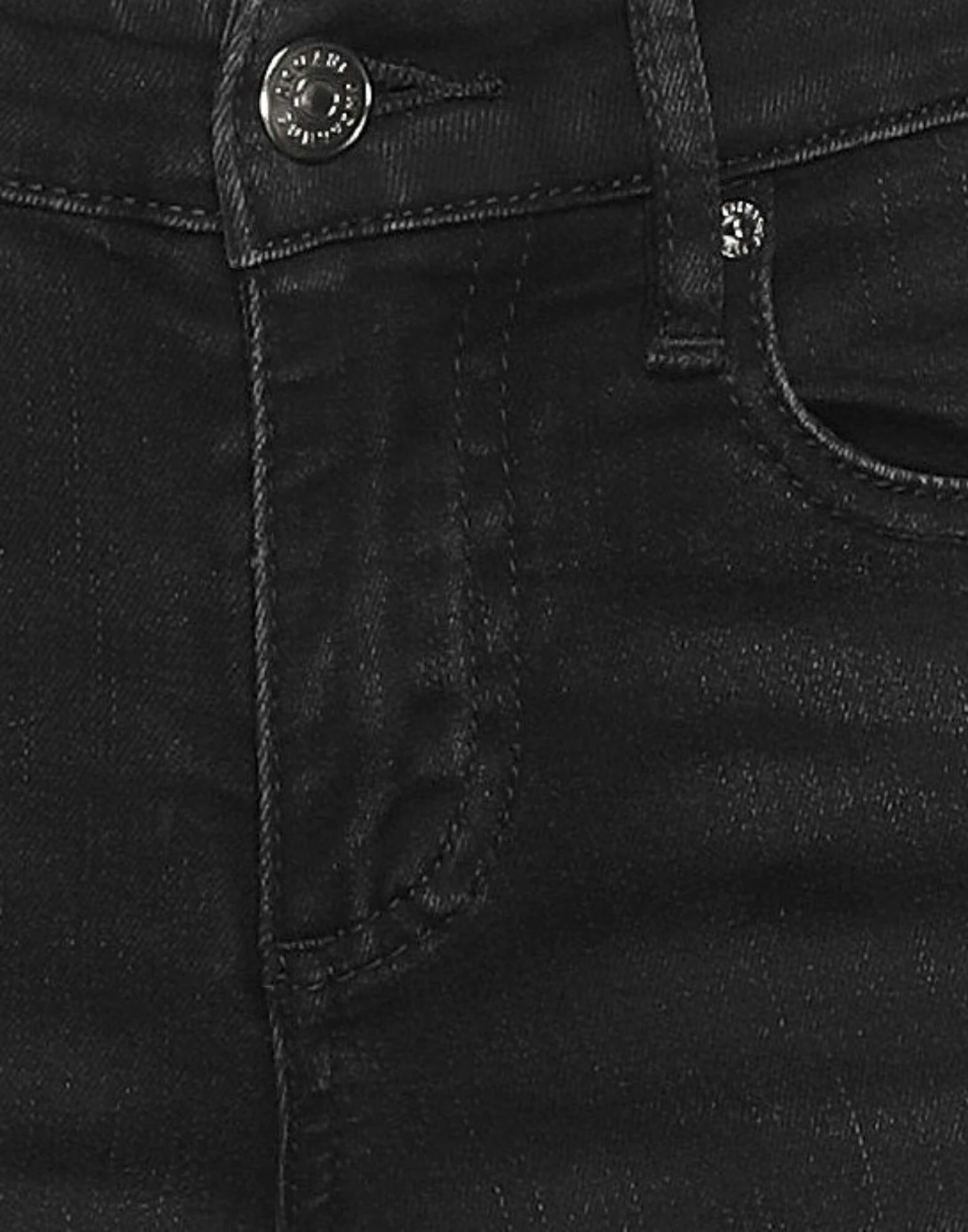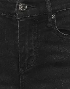 denim, faded, brand logo, solid color, colored wash, low waisted, belt loops, tapered leg, slim-leg pants, 1 button, zipper closure, five pockets, stretch