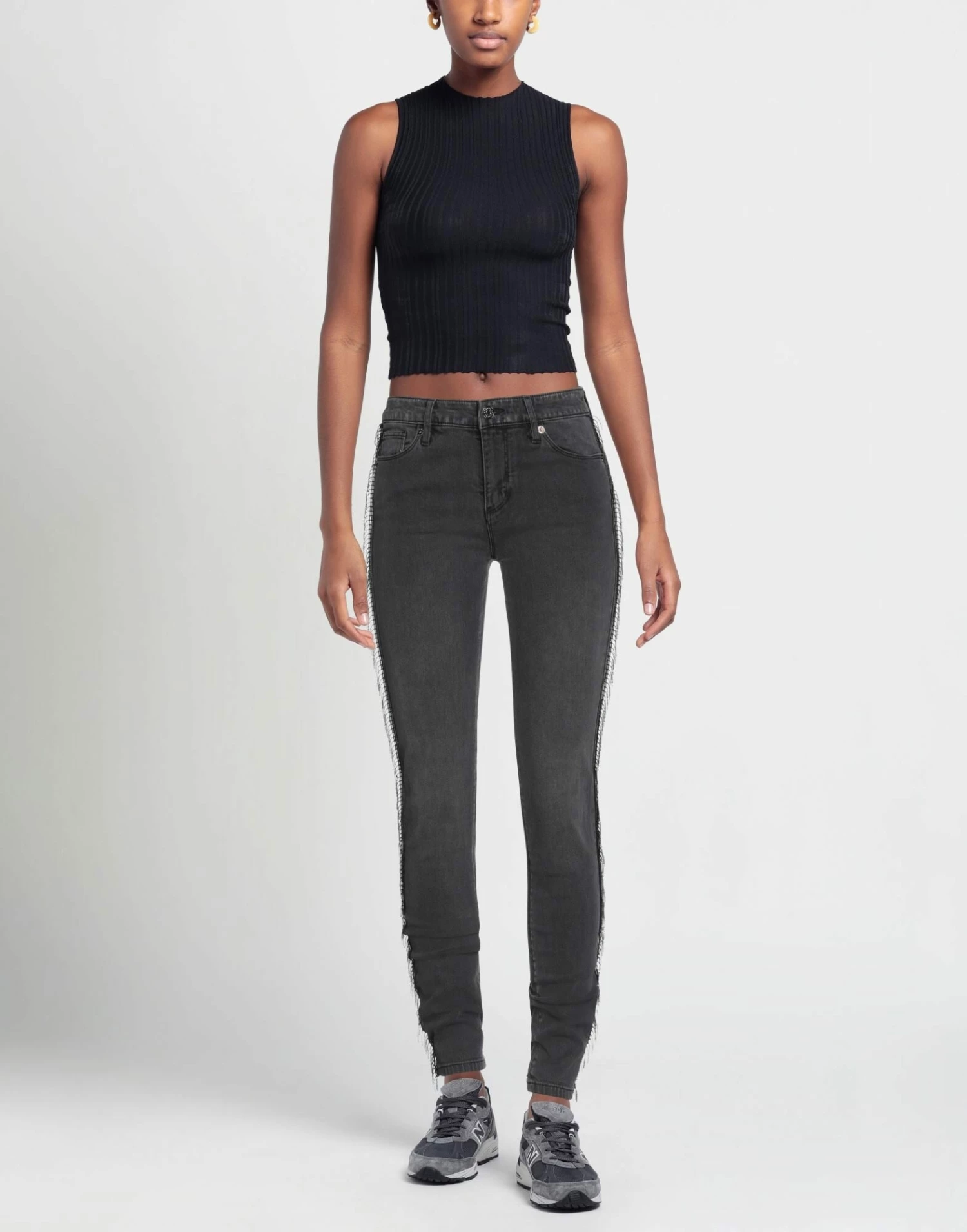 tulle, denim, metal applications, solid color, colored wash, mid rise, slim-leg pants, straight leg, 1 button, zipper closure, multipockets