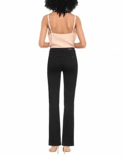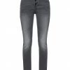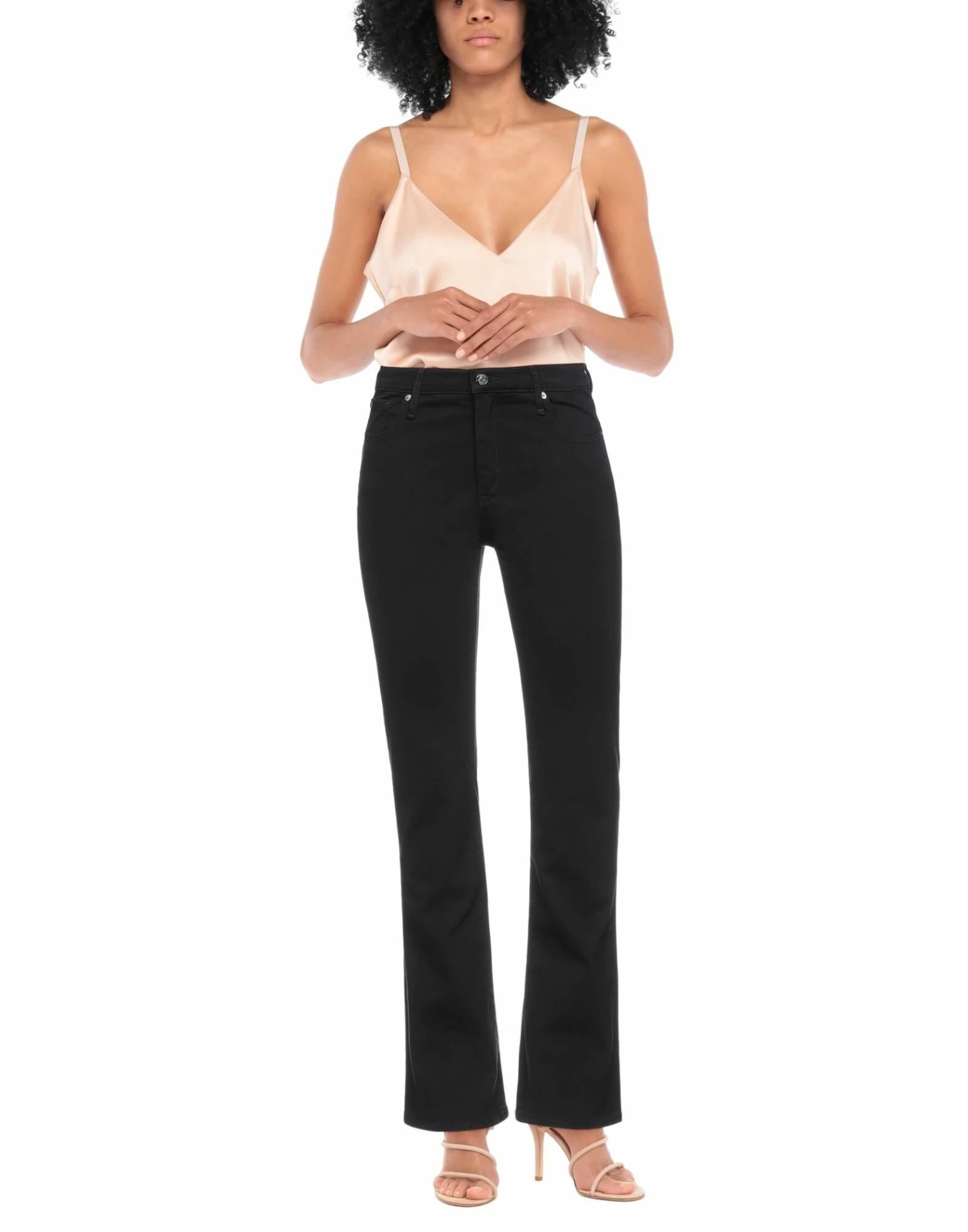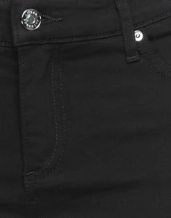 denim, logo, solid color, dark wash, mid rise, front closure, button, zip, multipockets, stretch