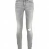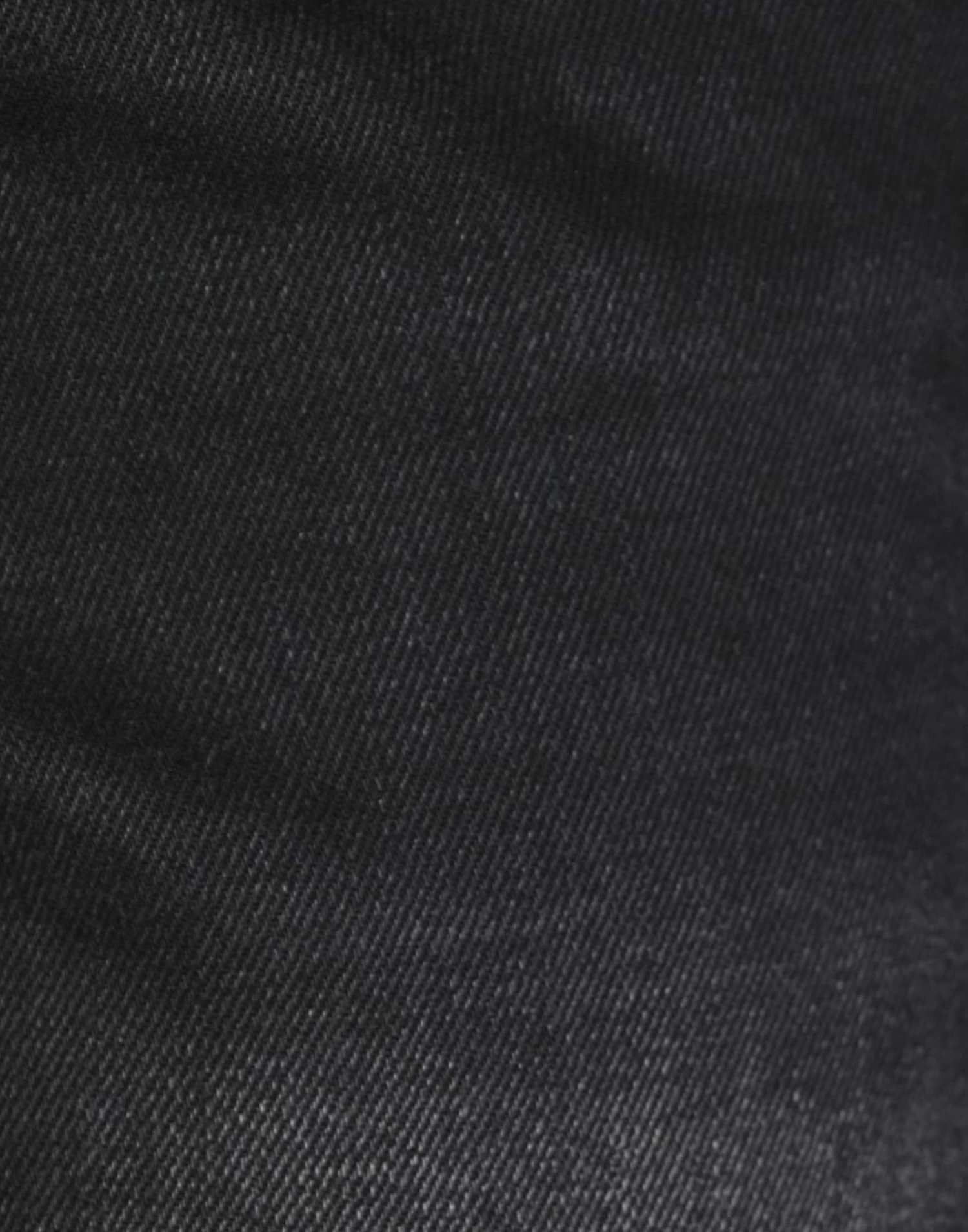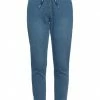 denim, worn effect, leather applications, logo, solid color, colored wash, mid rise, front closure, button, zip, multipockets, raw-cut hem, stretch, contains non-textile parts of animal origin