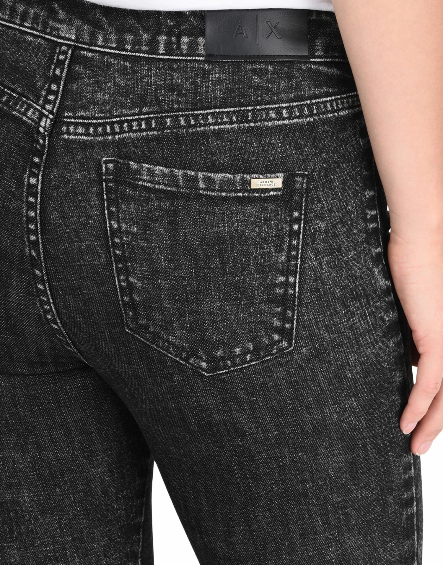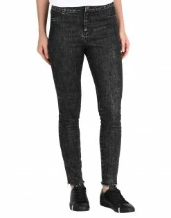 denim, faded, logo, solid color, colored wash, high waisted, front closure, button, zip, multipockets, zips at hem, contains non-textile parts of animal origin, straight-leg pants