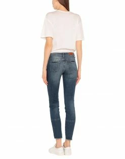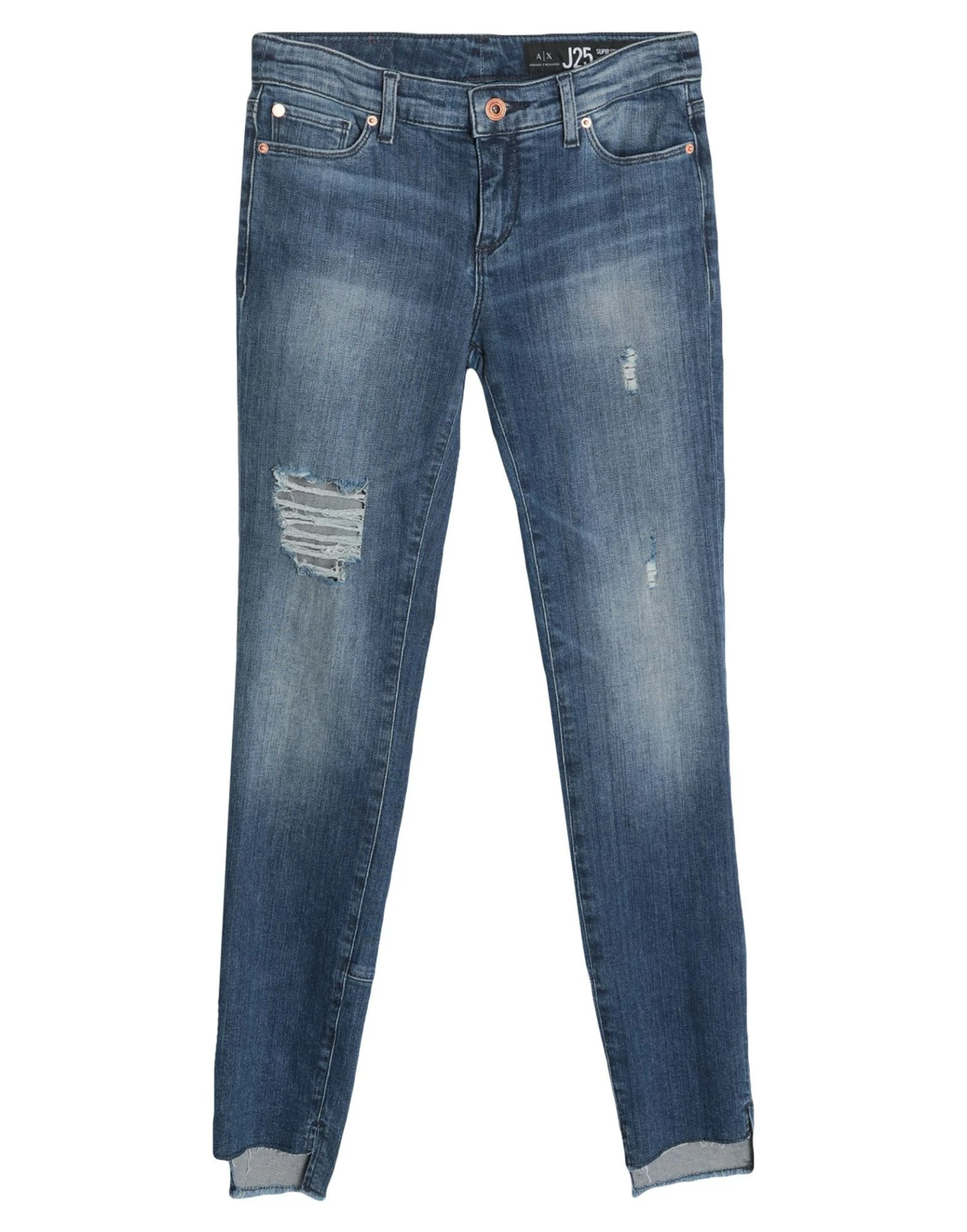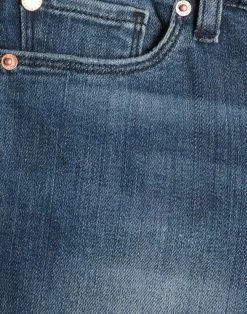denim, faded, leather applications, logo, solid color, medium wash, torn fabric, mid rise, front closure, button, zip, multipockets, stretch, contains non-textile parts of animal origin