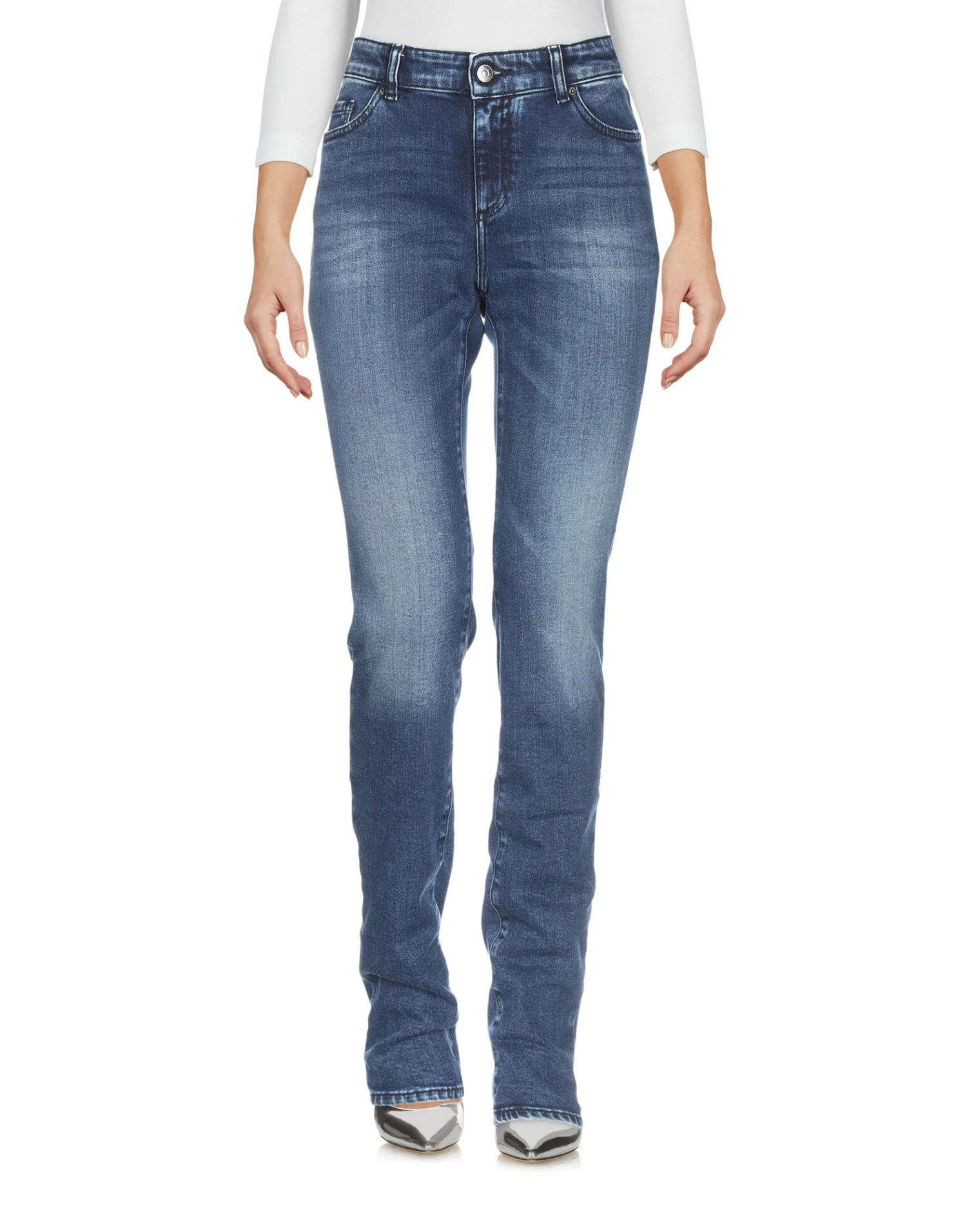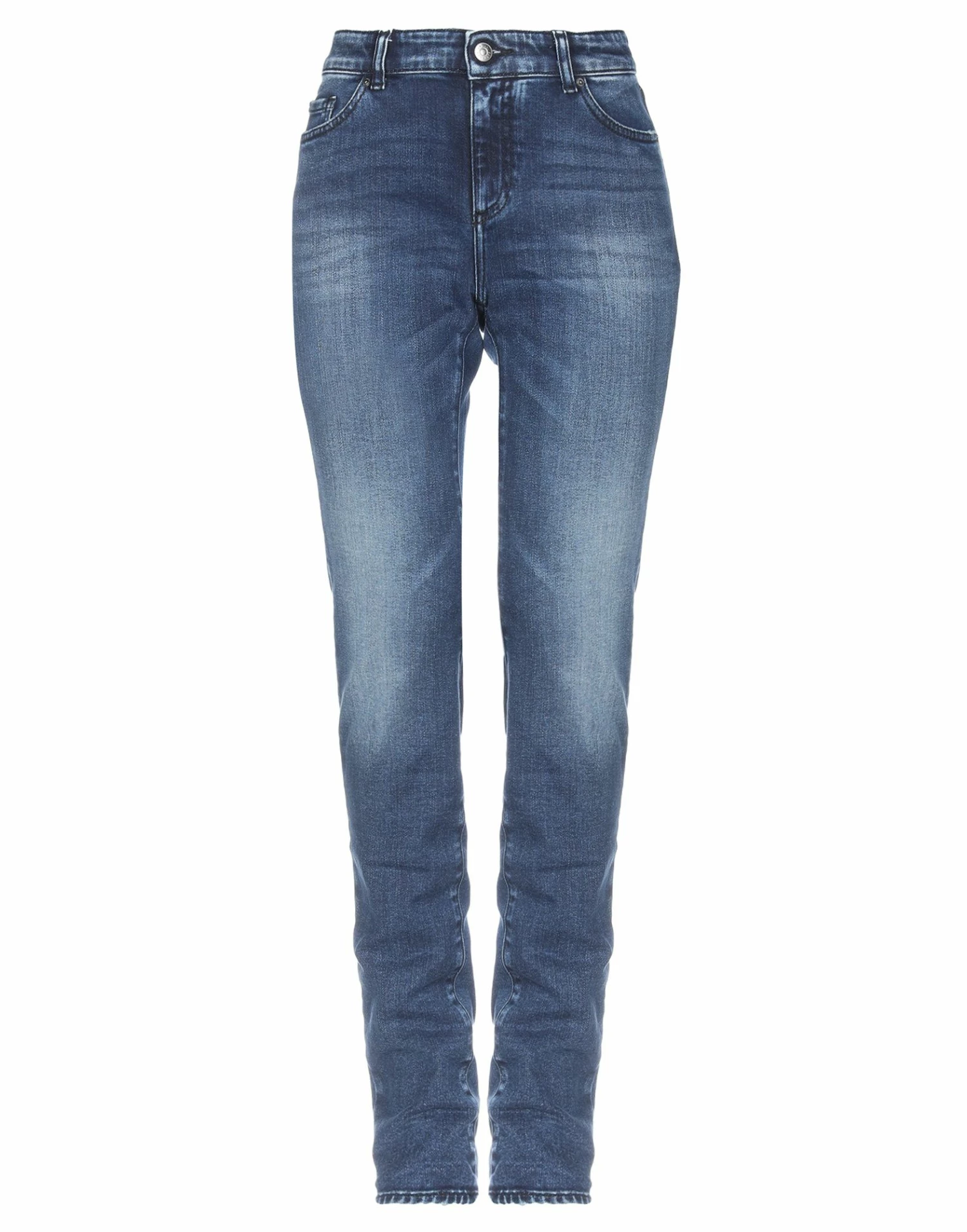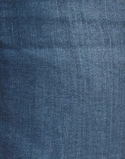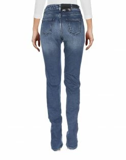 denim, faded, logo, solid color, medium wash, low waisted, front closure, button, zip, multipockets