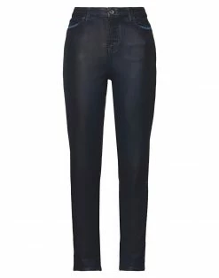 denim, solid color, coated effect, brand logo, high waisted, slim-leg pants, tapered leg, zipper closure, multipockets, dark wash