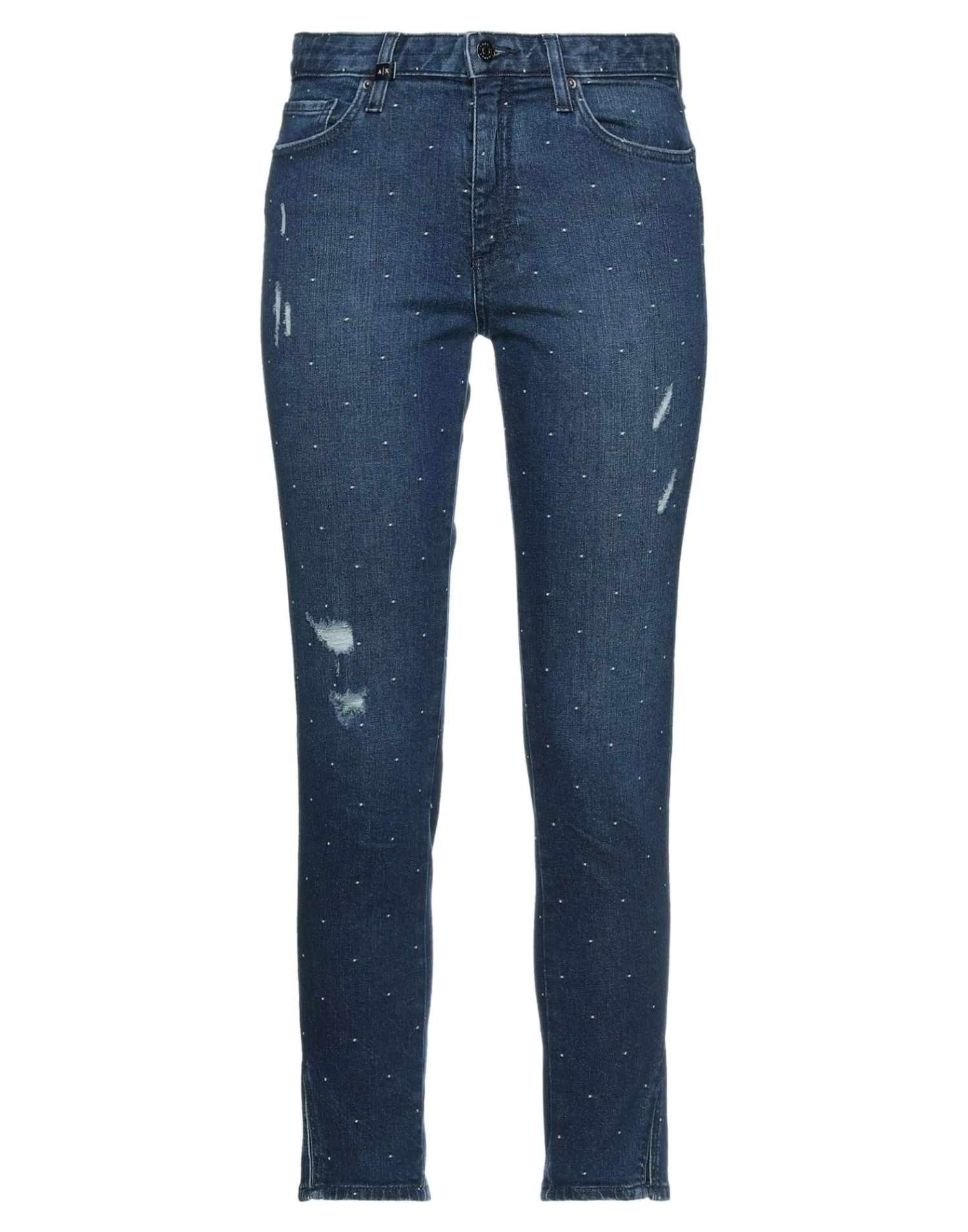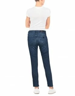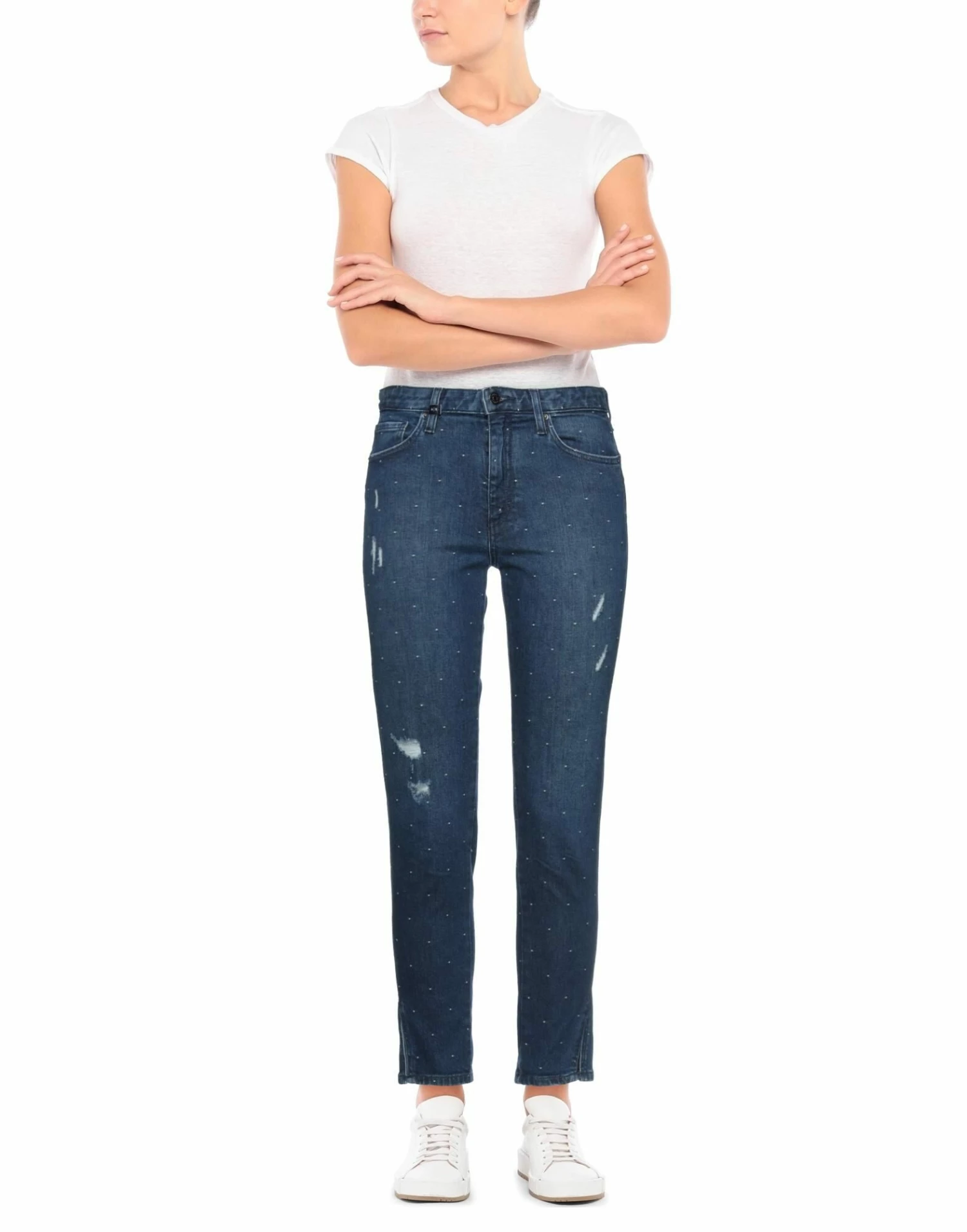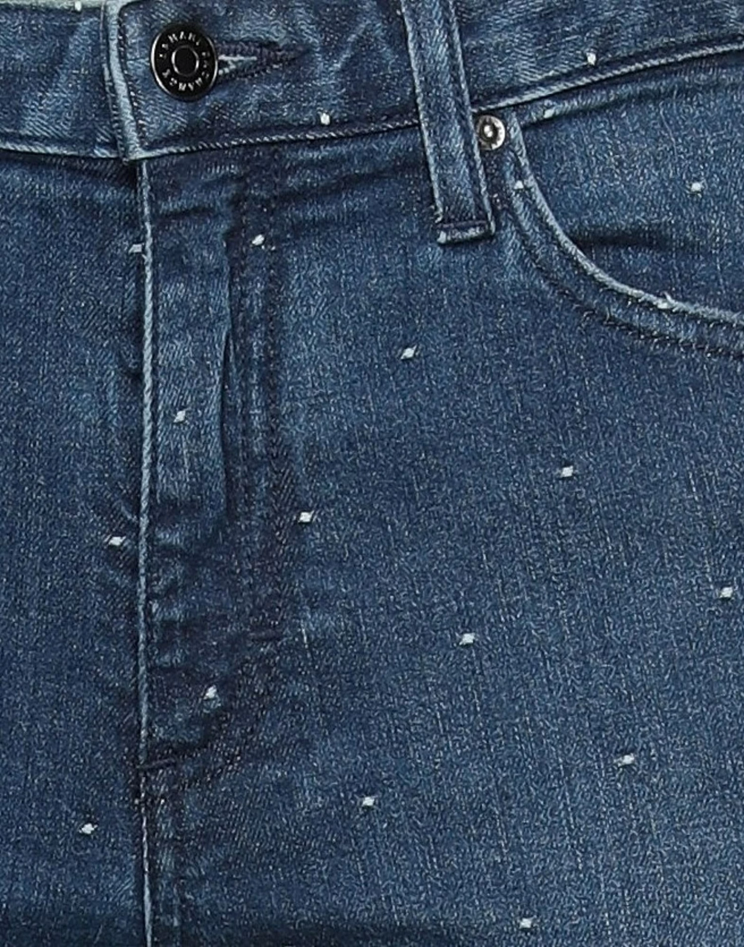 denim, faded, torn fabric, leather applications, brand logo, solid colour with appliqués, dark wash, mid rise, tapered leg, slim-leg pants, 1 button, zipper closure, multipockets, contains non-textile parts of animal origin