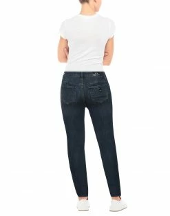 denim, faded, logo, solid color, dark wash, mid rise, front closure, button, zip, multipockets