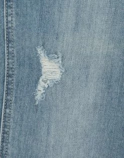 denim, torn fabric, faded, logo, metal applications, solid color, medium wash, mid rise, front closure, button, zip, multipockets, side slit hemline, contains non-textile parts of animal origin