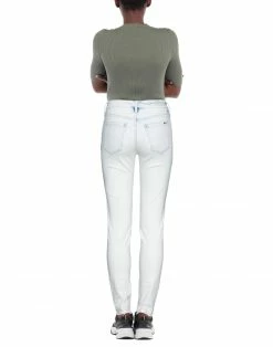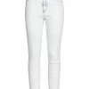 denim, faded, brand logo, solid color, light wash, mid rise, 1 button, zipper closure, five pockets, raw-cut hem
