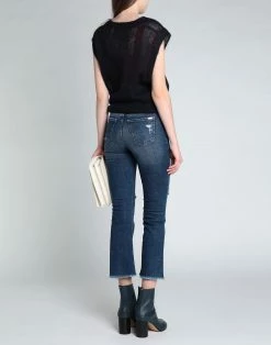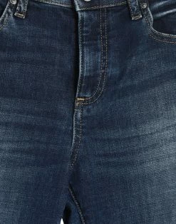 denim, torn fabric, faded, brand logo, solid color, dark wash, mid rise, belt loops, 1 button, zipper closure, multipockets, fringed hem, stretch