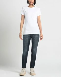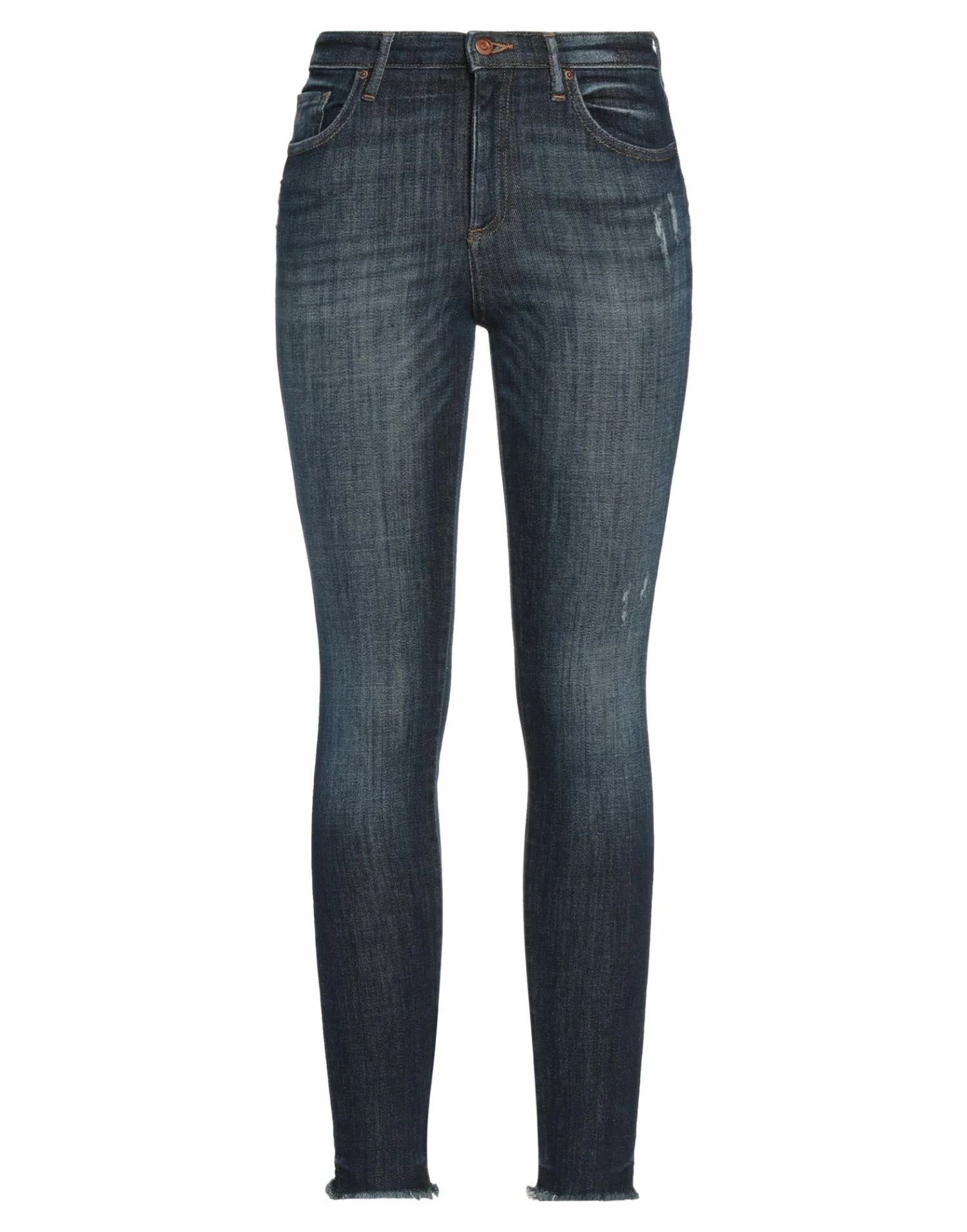 denim, faded, worn effect, solid color, brand logo, dark wash, mid rise, tapered leg, slim-leg pants, 1 button, zipper closure, five pockets, stretch, skinny model
