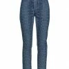 denim, brand logo, glitter, dark wash, mid rise, slim-leg pants, straight leg, multipockets, button closing, zipper closure, two-tone, stretch