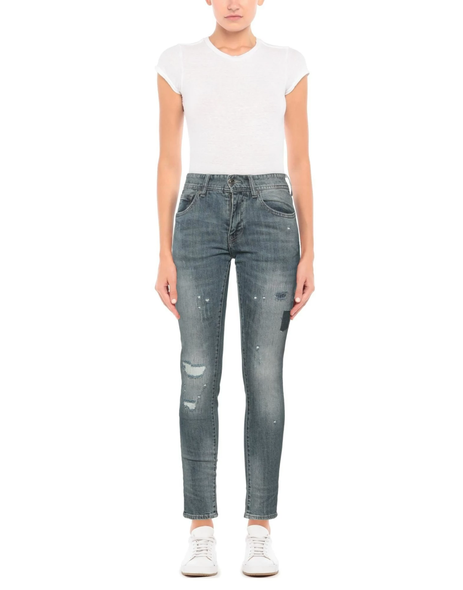 denim, faded, worn effect, leather applications, brand logo, solid color, mid rise, tapered leg, slim-leg pants, 1 button, zipper closure, five pockets, contains non-textile parts of animal origin, dark wash