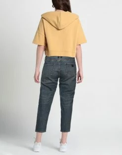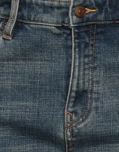 denim, faded, brand logo, solid color, medium wash, high waisted, 1 button, zipper closure, multipockets, stretch