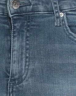 denim, faded, medium wash, brand logo, mid rise, solid color, slim-leg pants, tapered leg, button closing, zipper closure, multipockets, contains non-textile parts of animal origin, stretch