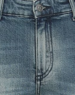 denim, worn effect, faded, medium wash, brand logo, mid rise, solid color, regular fit, tapered leg, 1 button, zipper closure, five pockets