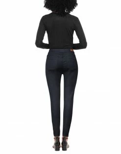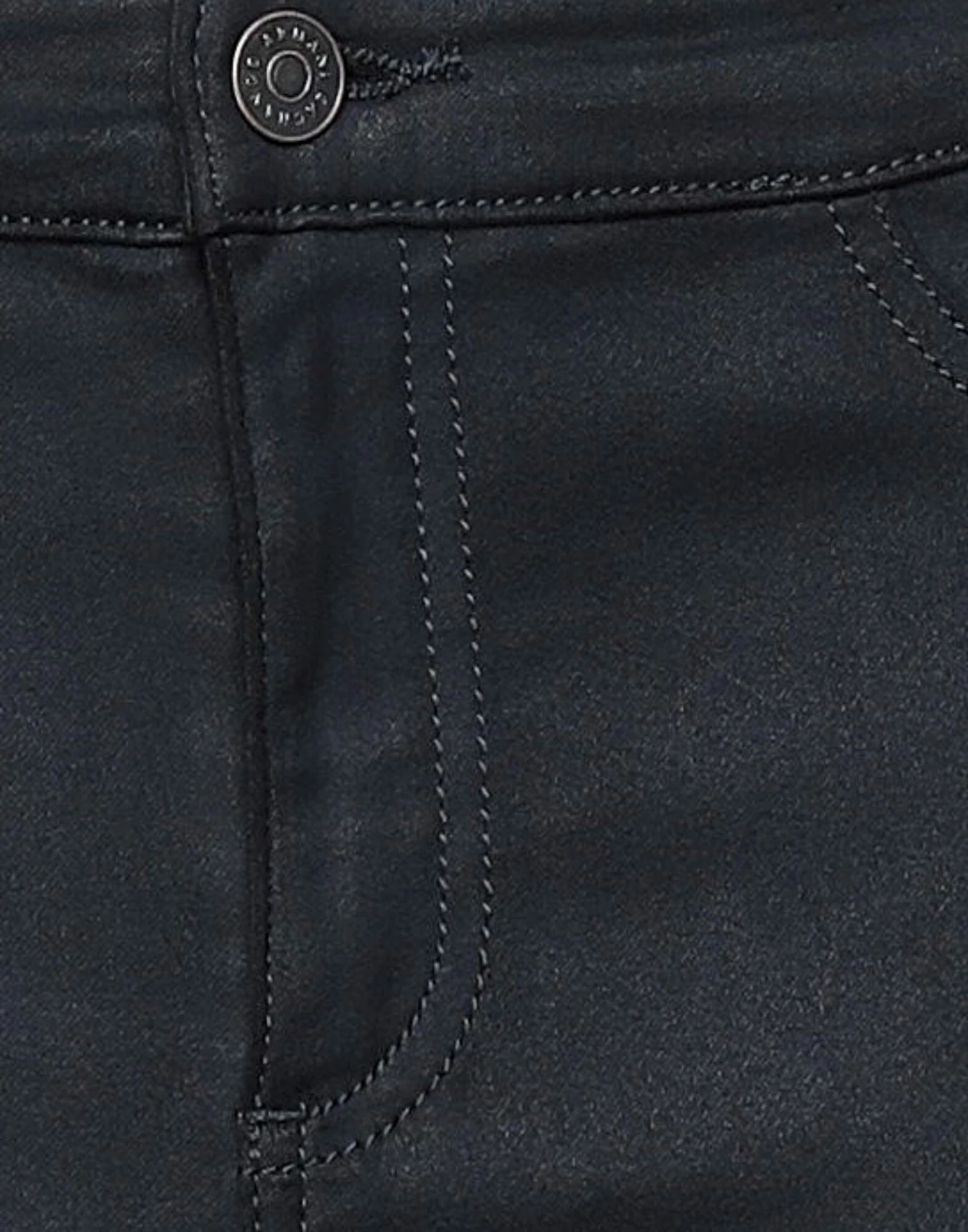 denim, leather applications, logo, solid color, colored wash, mid rise, front closure, button, zip, multipockets, zips at hem, stretch, contains non-textile parts of animal origin