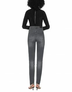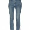 denim, faded, brand logo, mid rise, solid color, belt loops, slim-leg pants, tapered leg, button closing, multipockets, stretch, colored wash