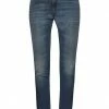 denim, torn fabric, faded, logo, solid color, colored wash, mid rise, front closure, button, zip, multipockets, fringed hem, slim fit