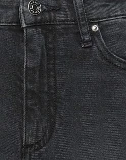 denim, faded, brand logo, leather applications, colored wash, solid color, mid rise, straight leg, slim-leg pants, 1 button, zipper closure, multipockets, contains non-textile parts of animal origin