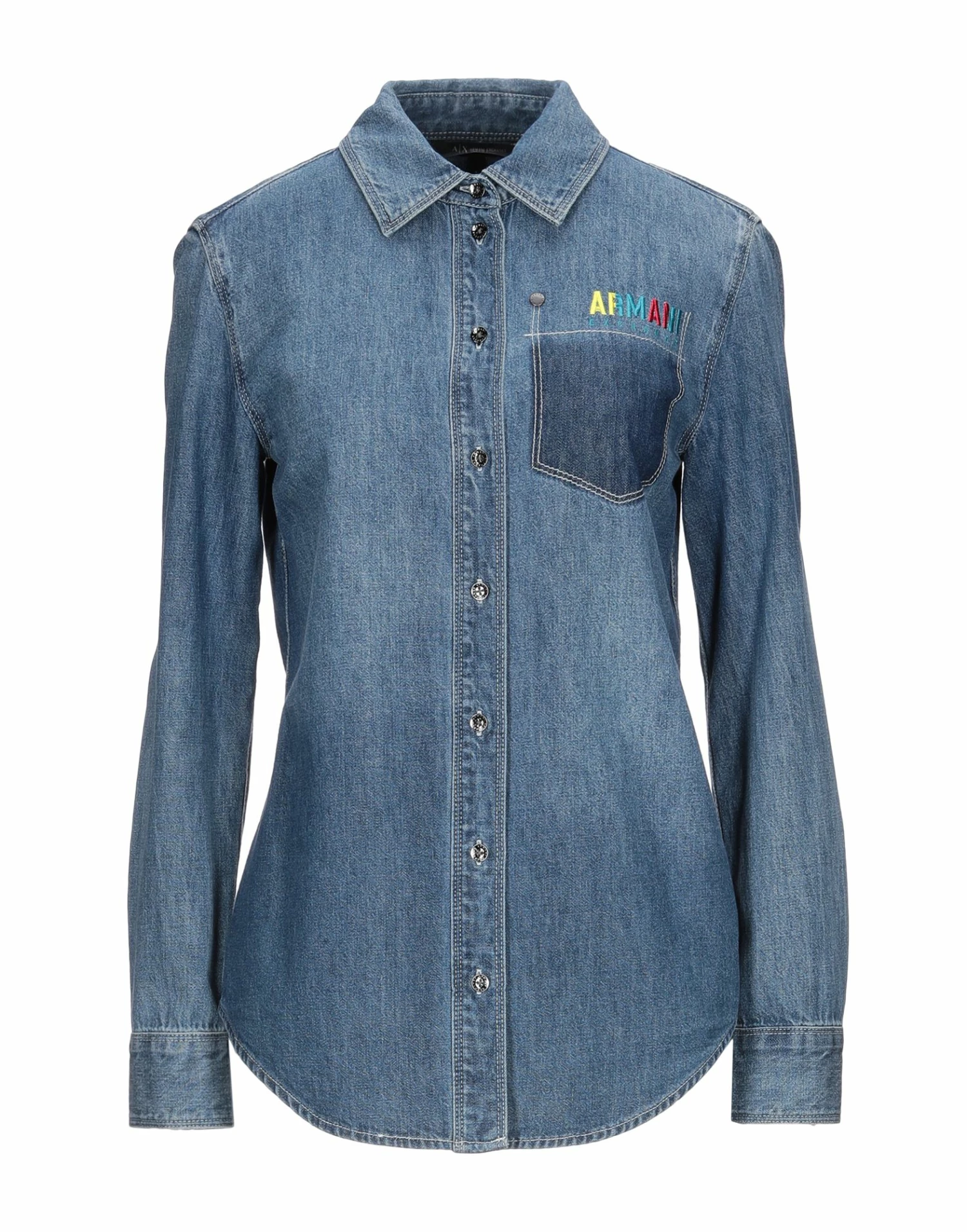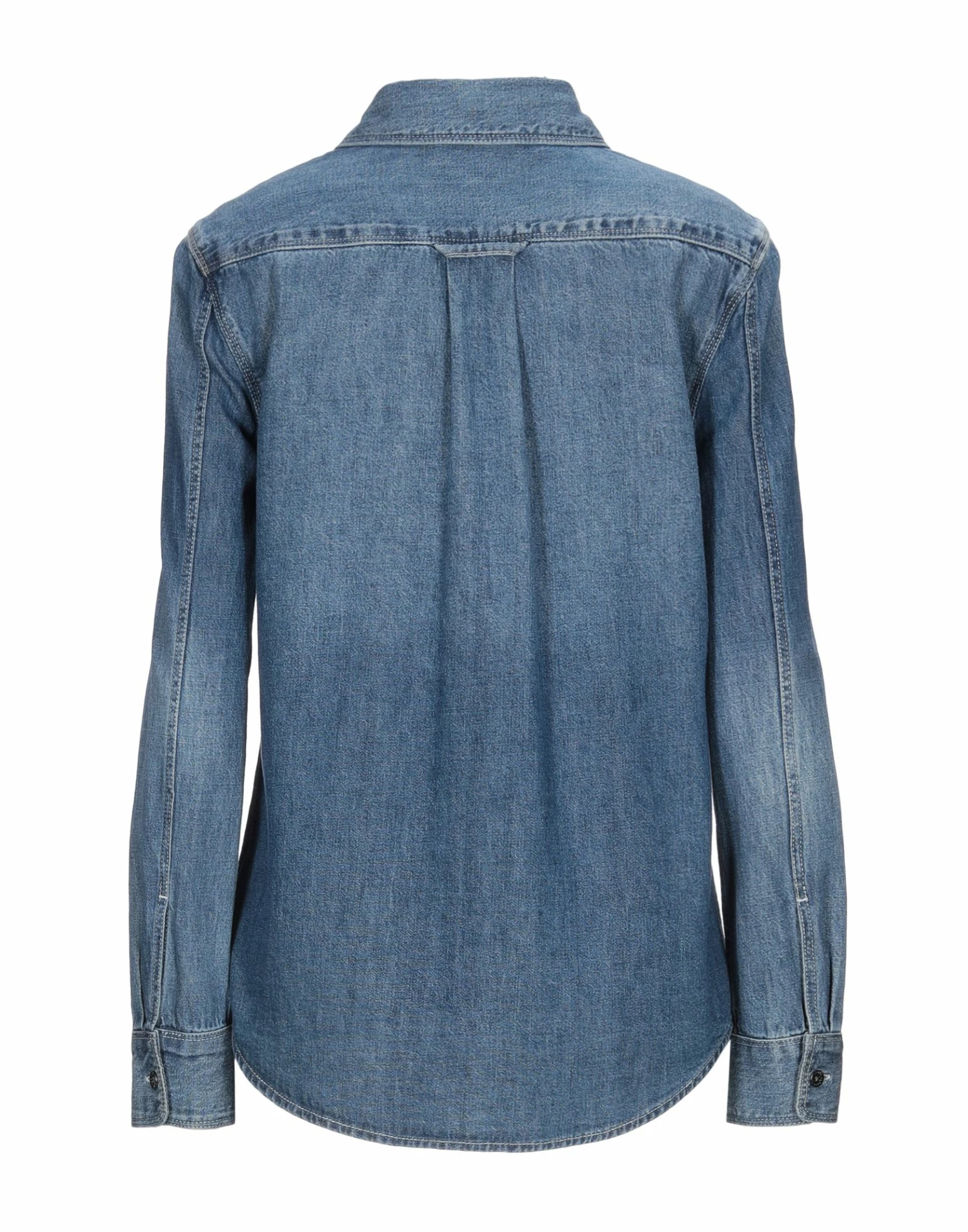 denim, faded, logo, solid color, medium wash, long sleeves, classic neckline, buttoned cuffs, front closure, button closing, no pockets