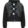 techno fabric, flashes, belt, multicolor pattern, lapel collar, double-breasted, long sleeves, unlined, snap buttons fastening, multipockets