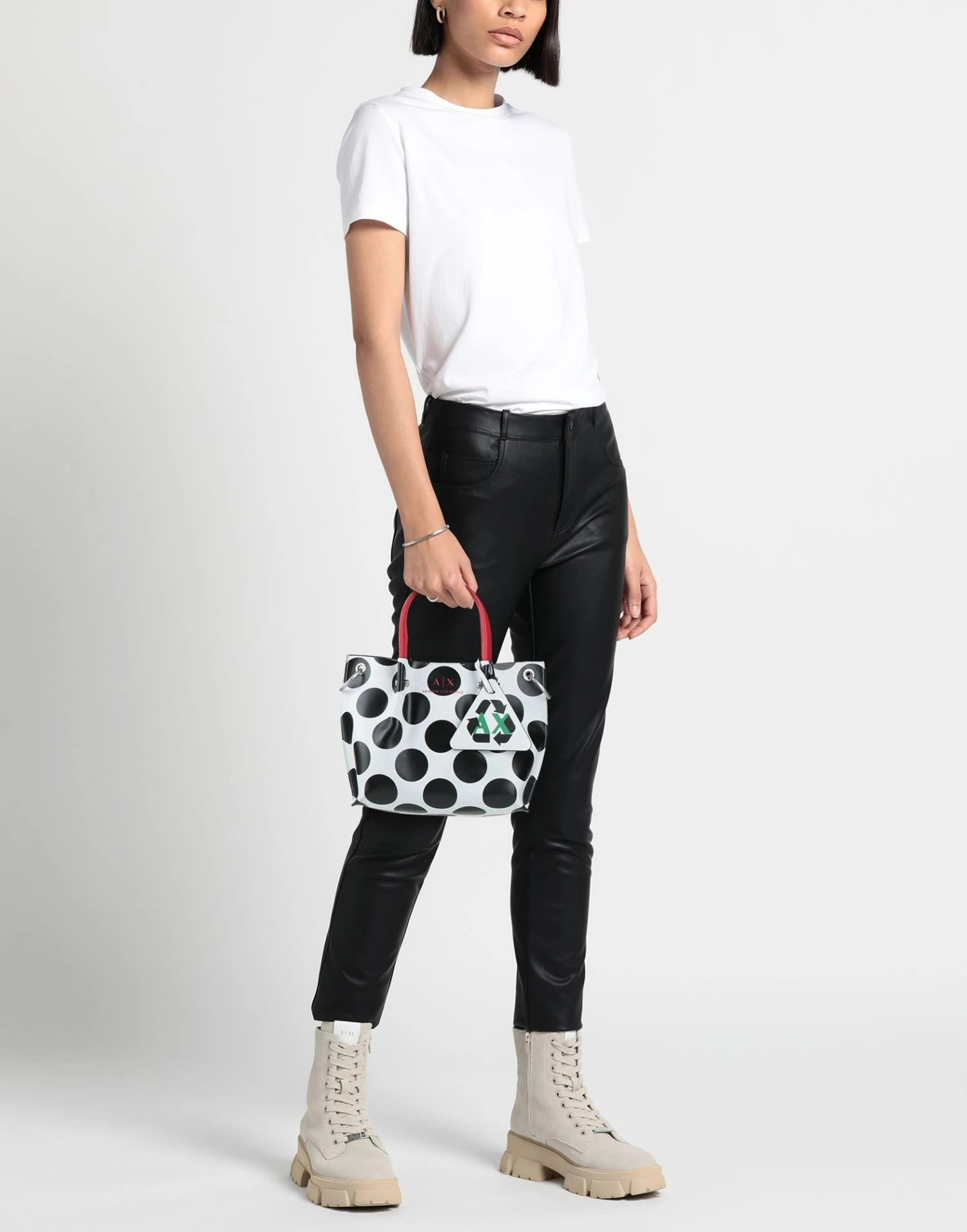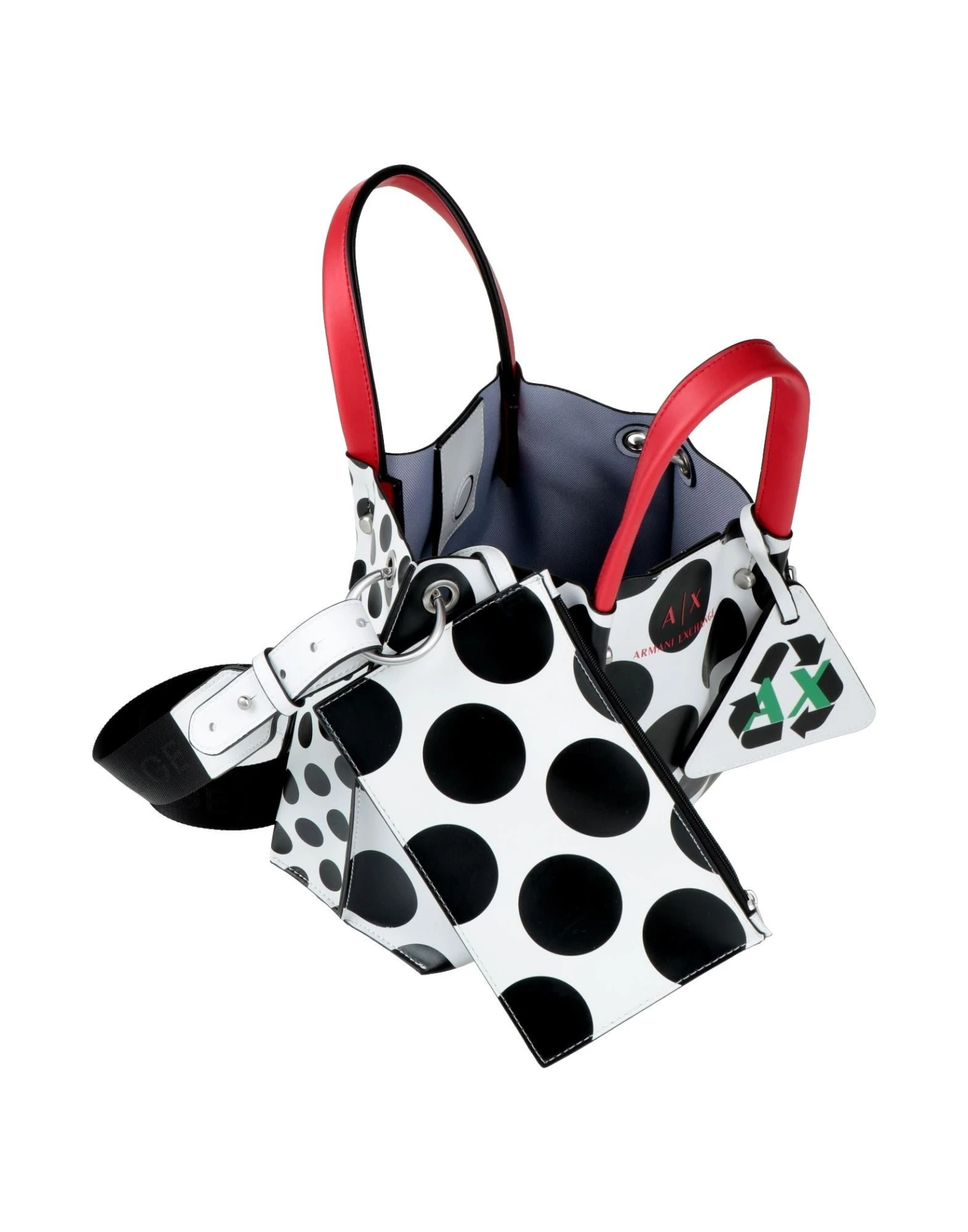 medium, coated fabric, detachable application, brand logo, polka-dot, unlined, magnetic fastening, double handle, detachable shoulder strap, detachable interior pouch, daytime