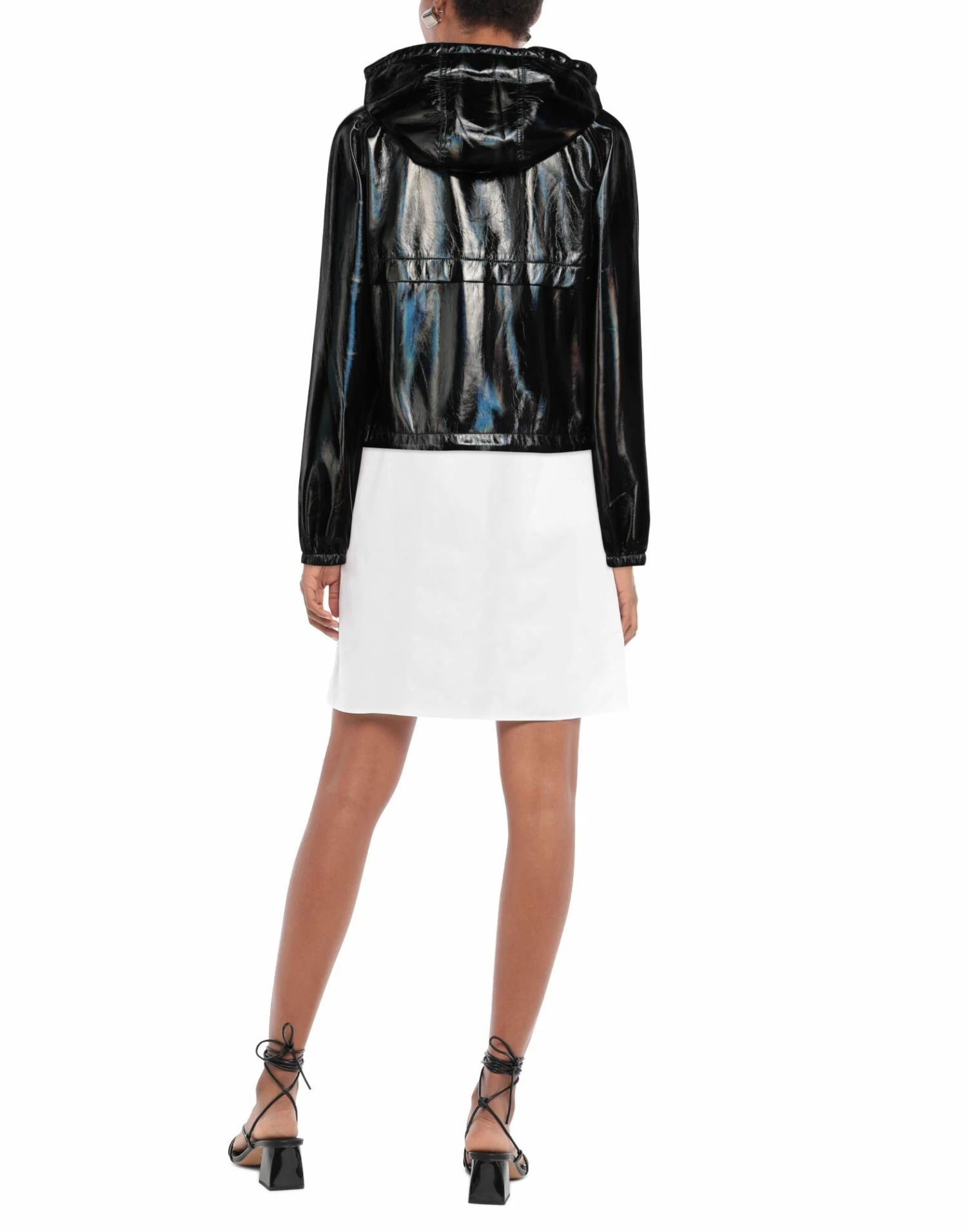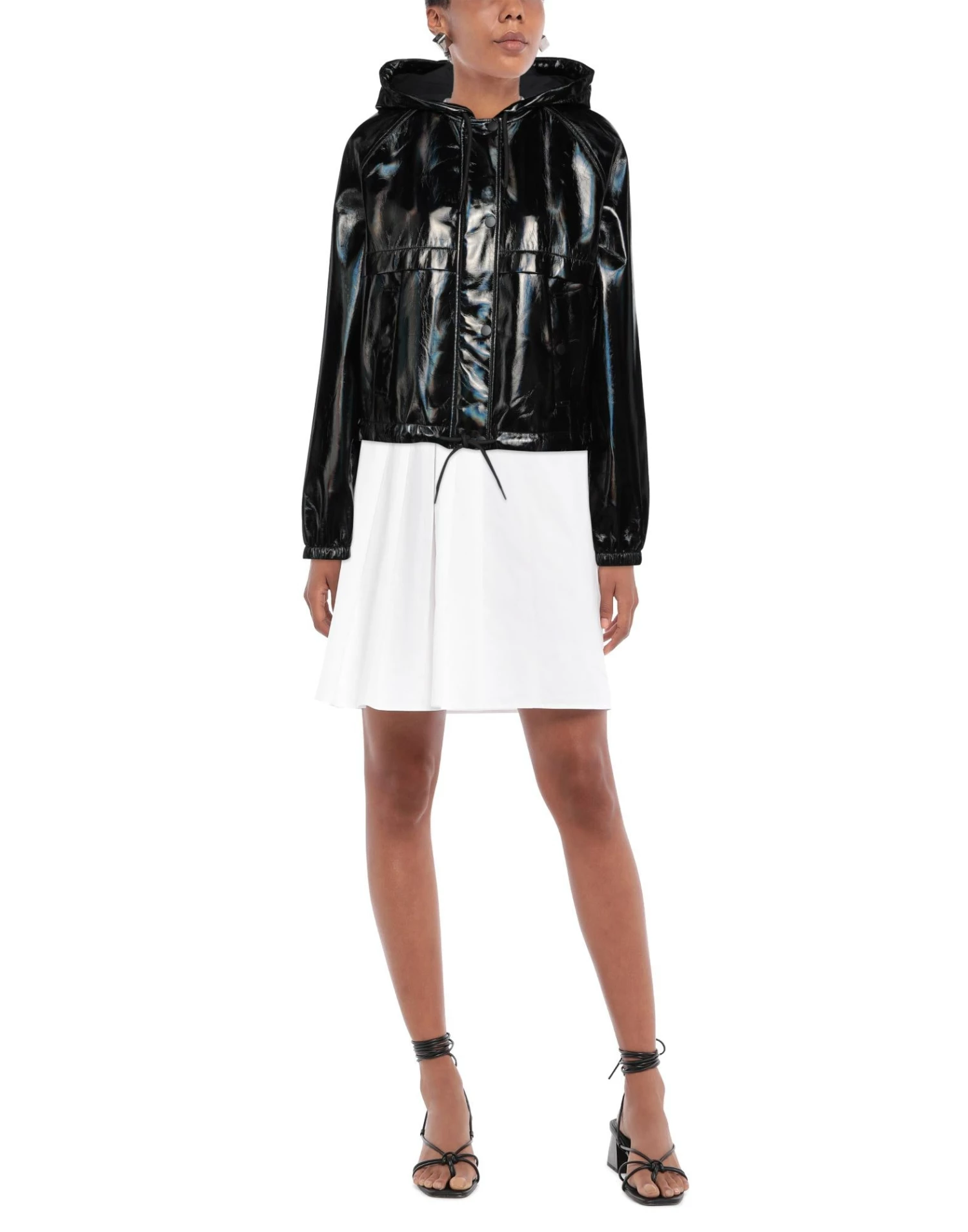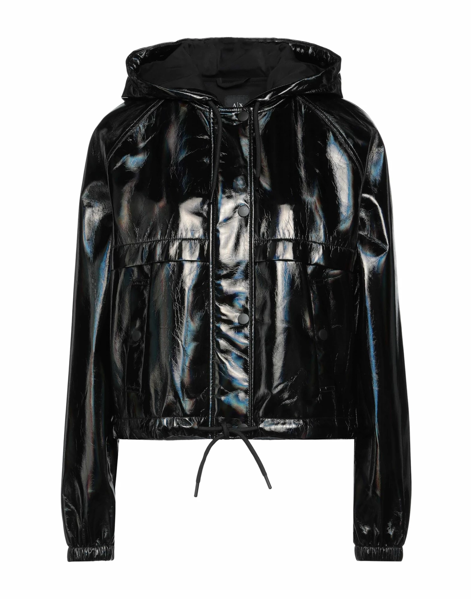 coated fabric, no appliqués, solid color, hooded collar, single-breasted , long sleeves, zipper closure, multipockets, varnished effect