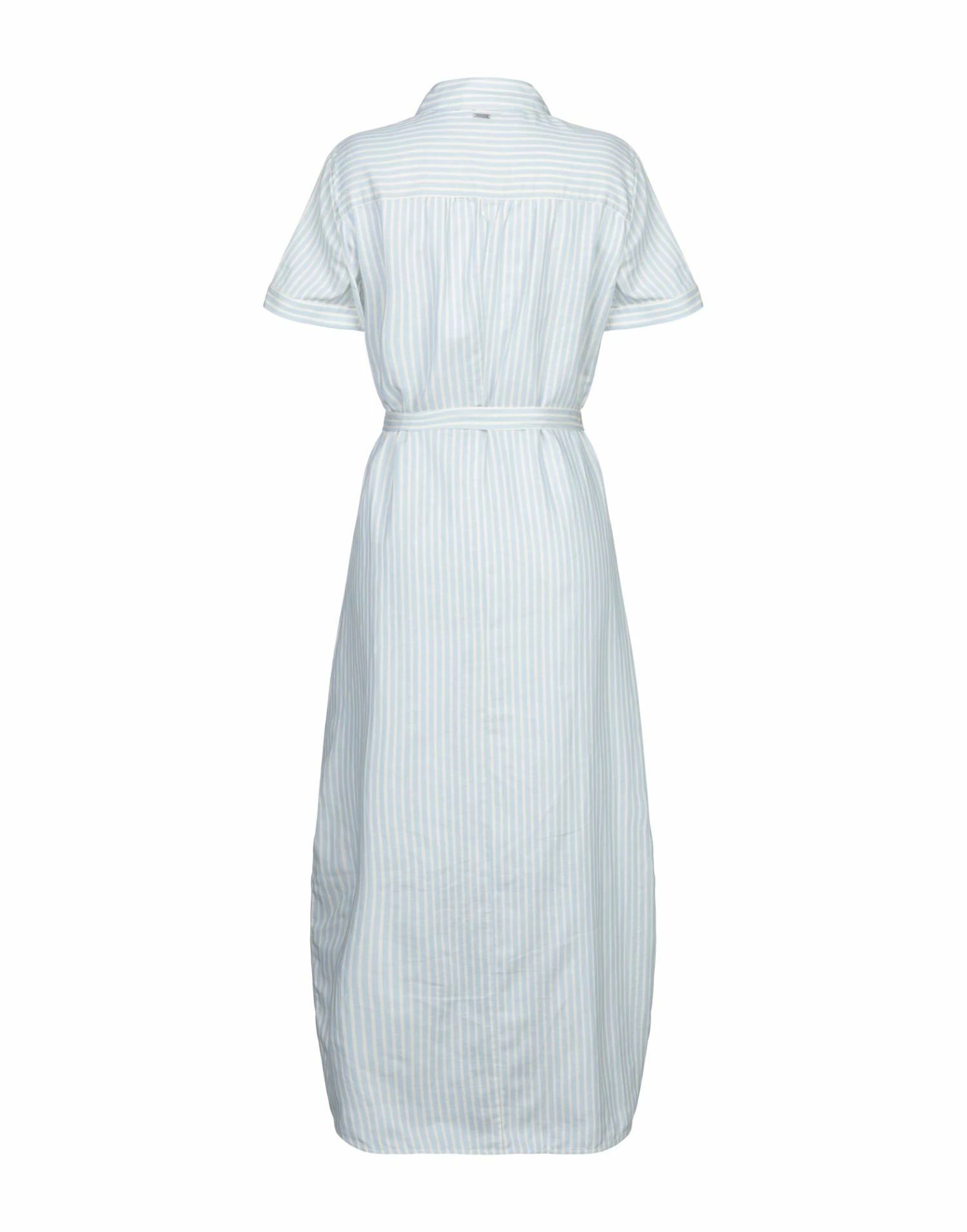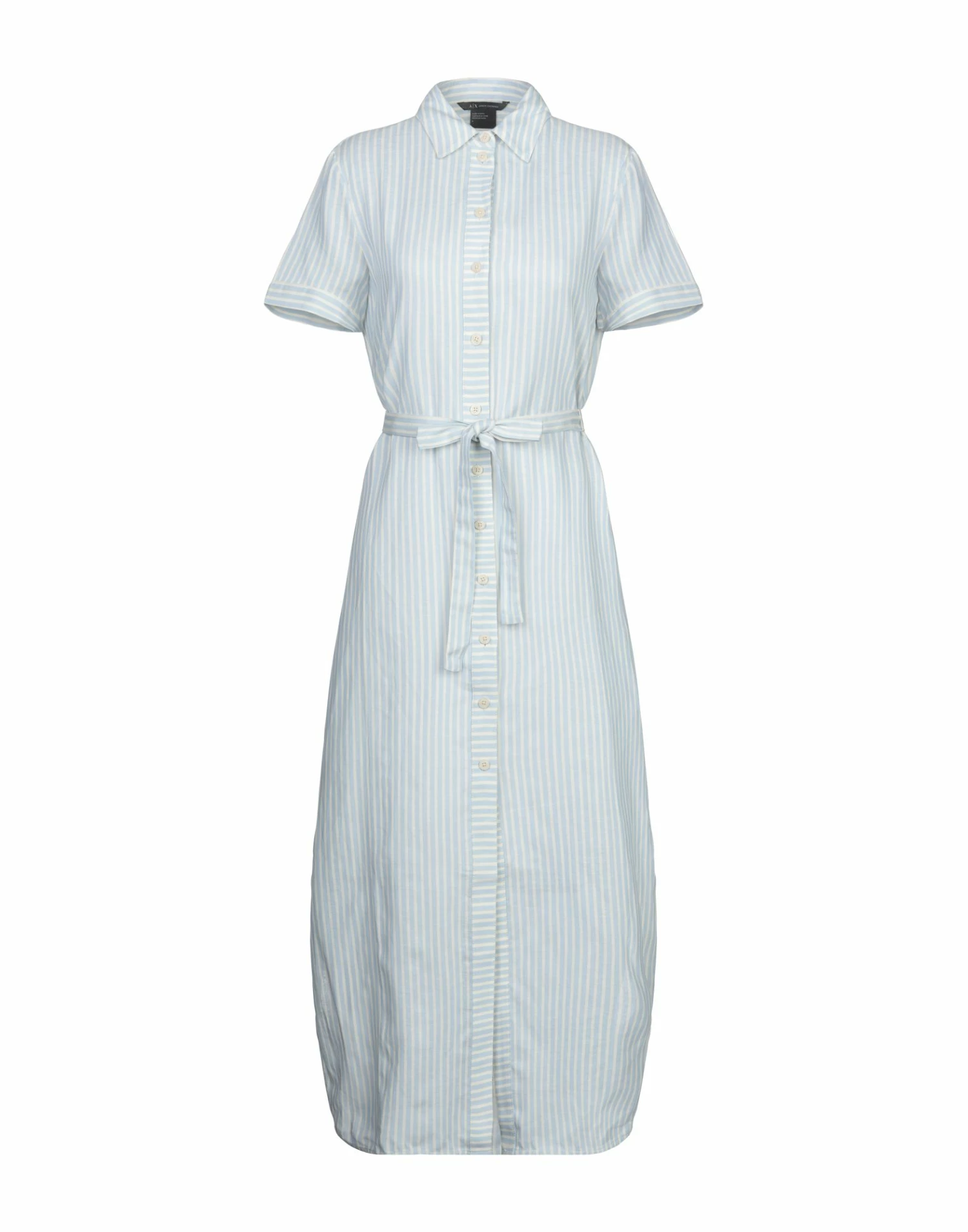 plain weave, belt, logo, stripes, classic neckline, short sleeves, no pockets, front closure, button closing, unlined, dual side vents, shirt dress