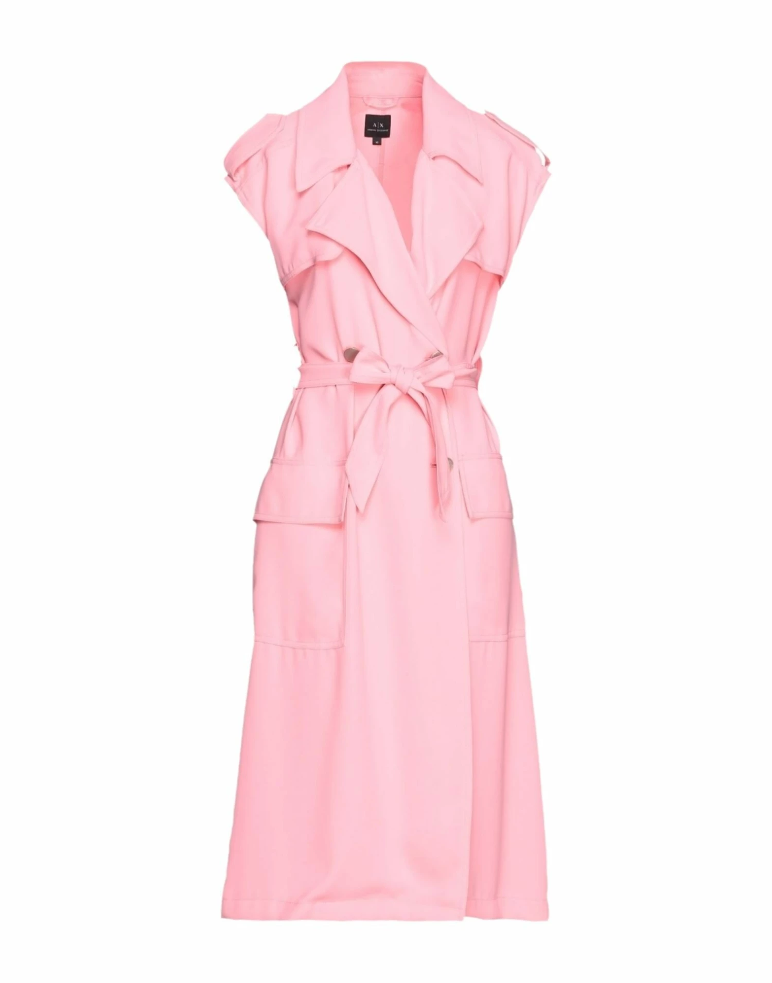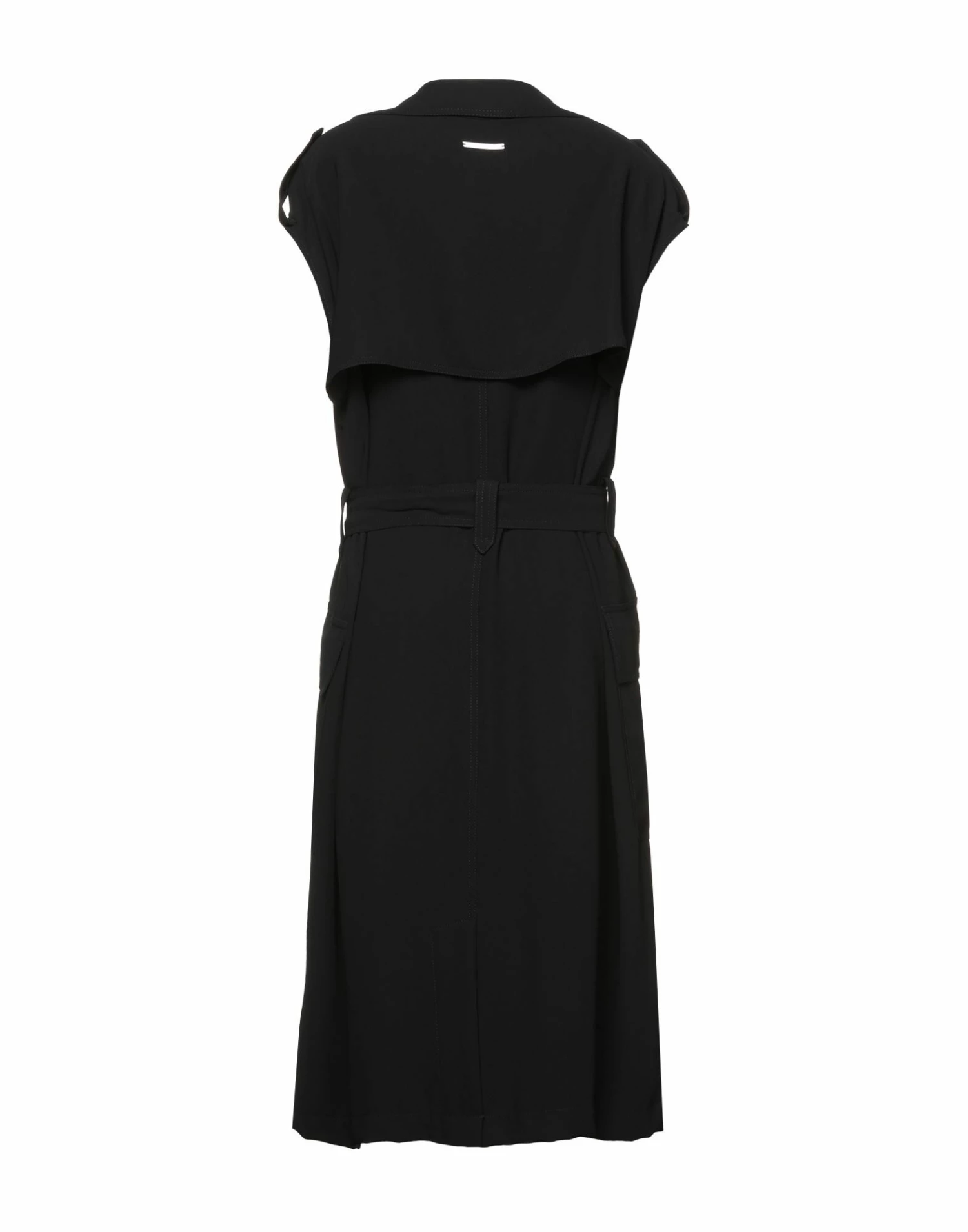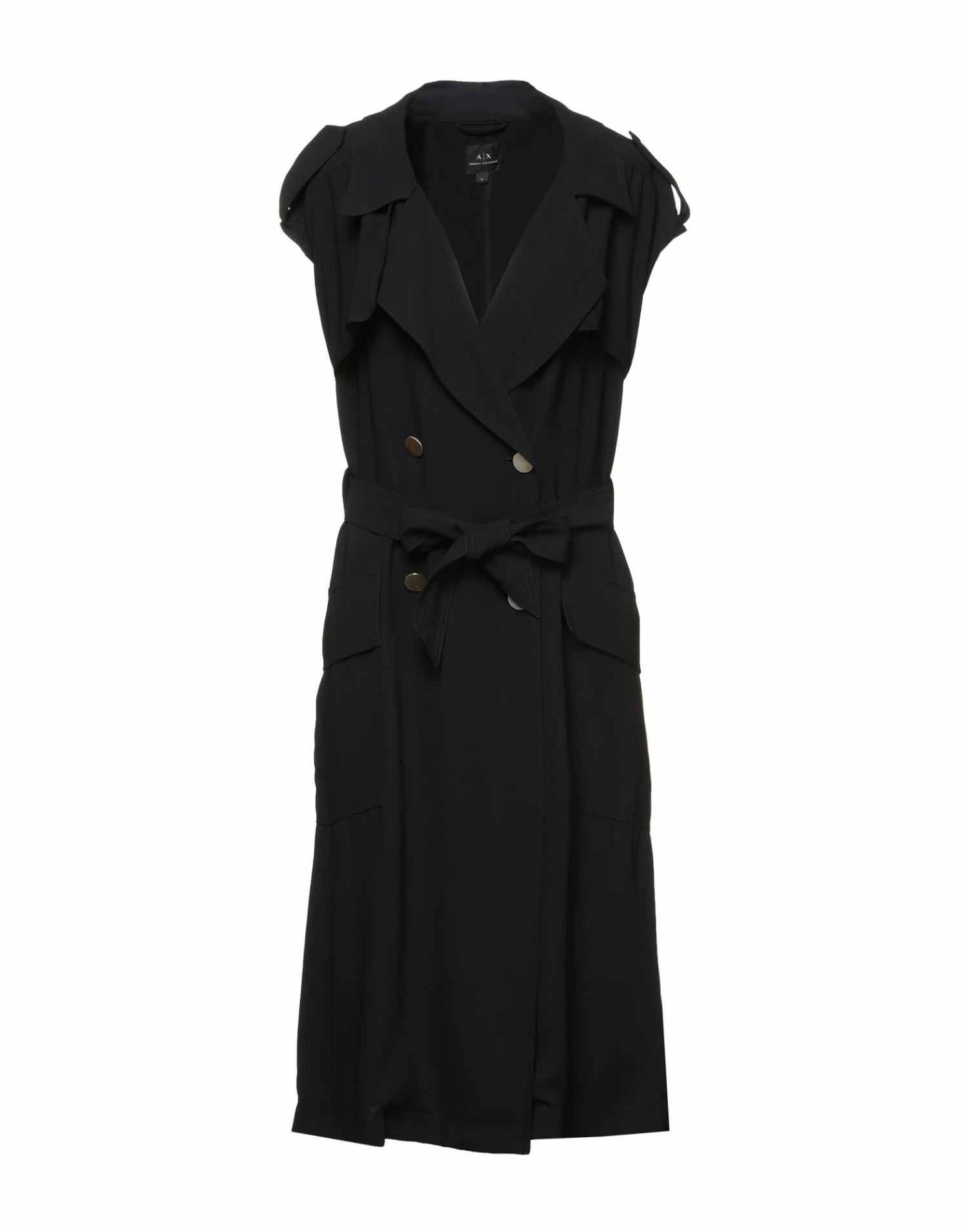 crepe, logo, belt, lapel collar, short sleeves, multipockets, front closure, button closing, unlined, solid color
