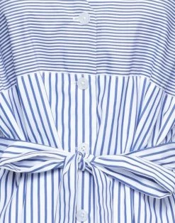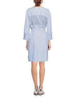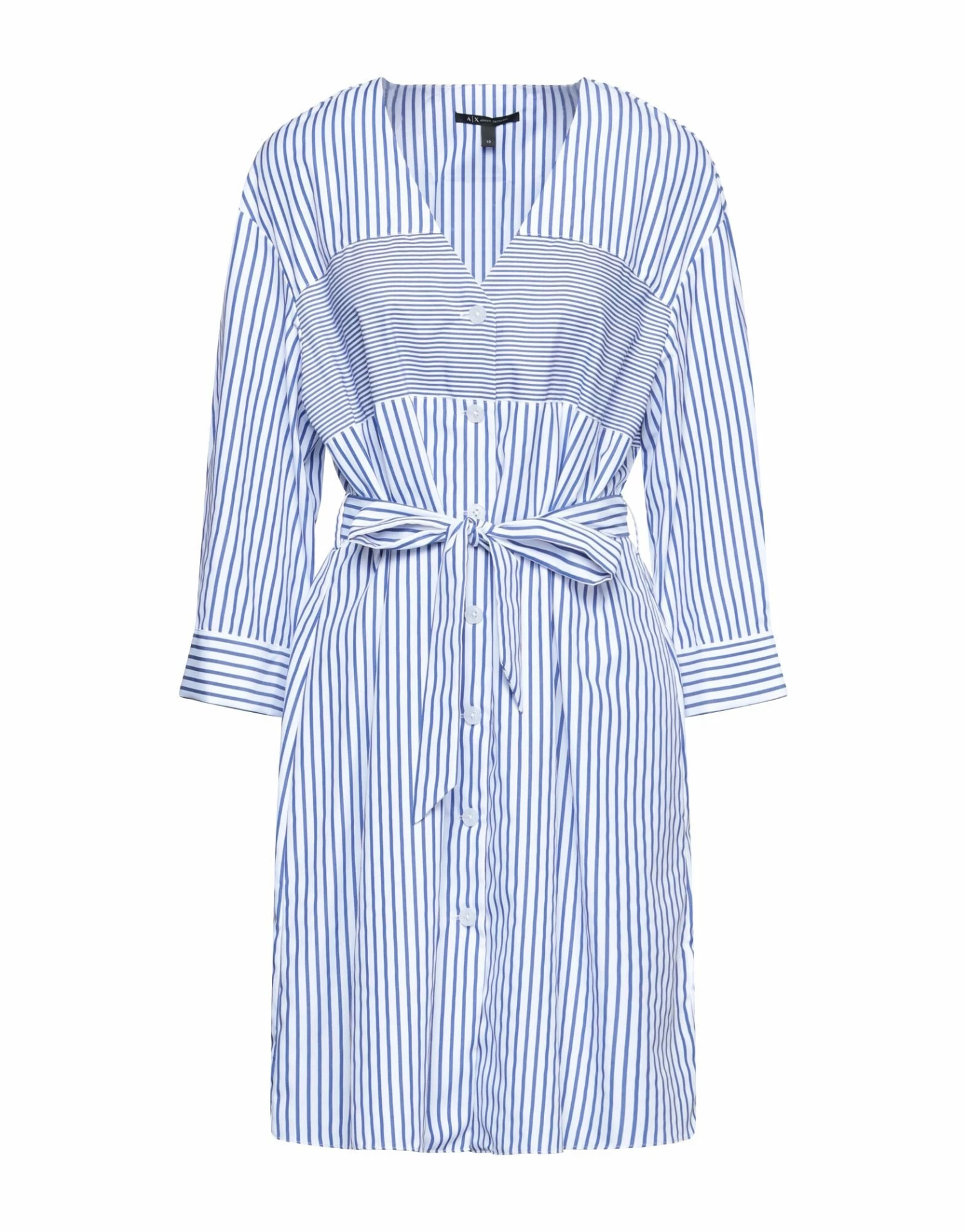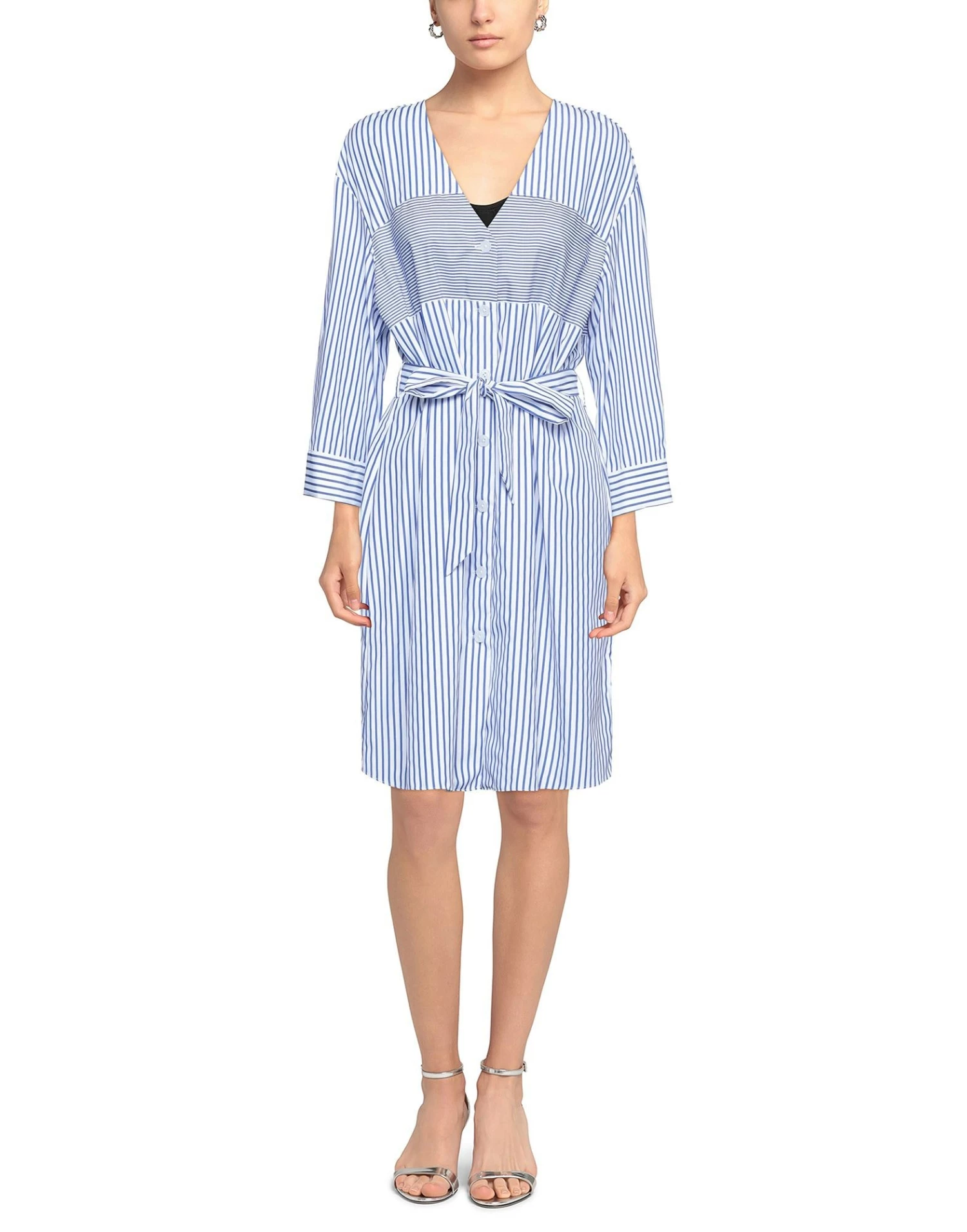 plain weave, brand logo, belt, stripes, v-neck, 3/4 length sleeves, no pockets, button closing, unlined