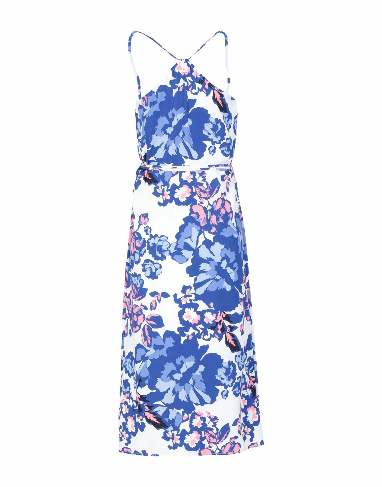 crepe, logo, floral design, deep neckline, sleeveless, no pockets, self-tie wrap closure, unlined