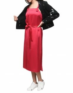 dual side vents, satin, logo, belt, basic solid color, square neckline, sleeveless, no pockets, side closure, zip, unlined, trapeze style
