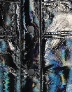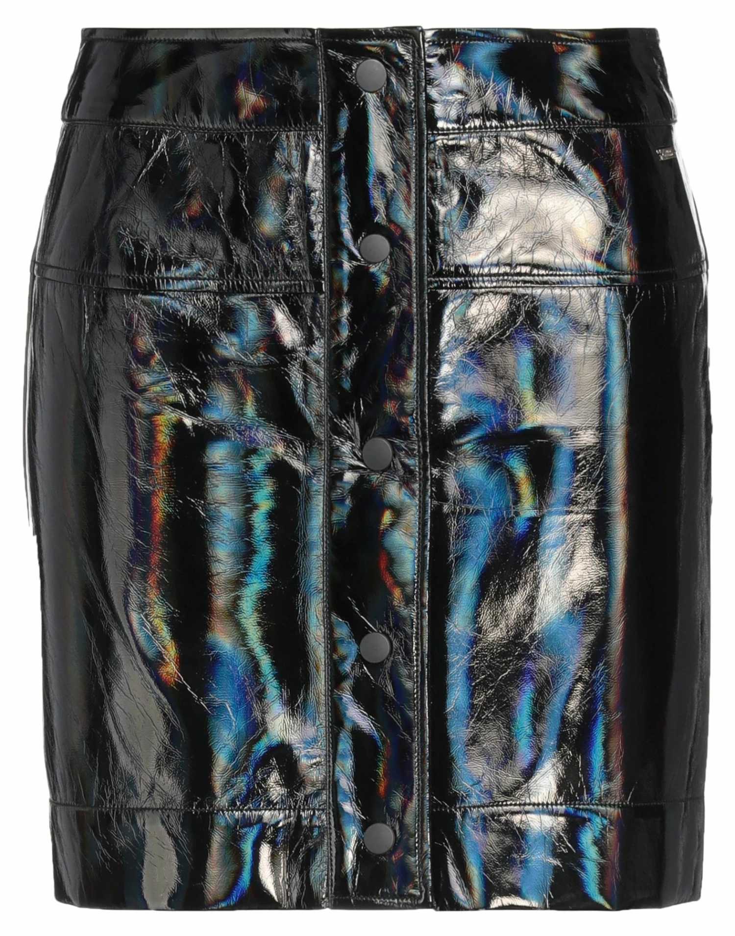 coated fabric, brand logo, laminated effect, solid colour with appliqués, fully lined, snap buttons fastening, no pockets, pencil style