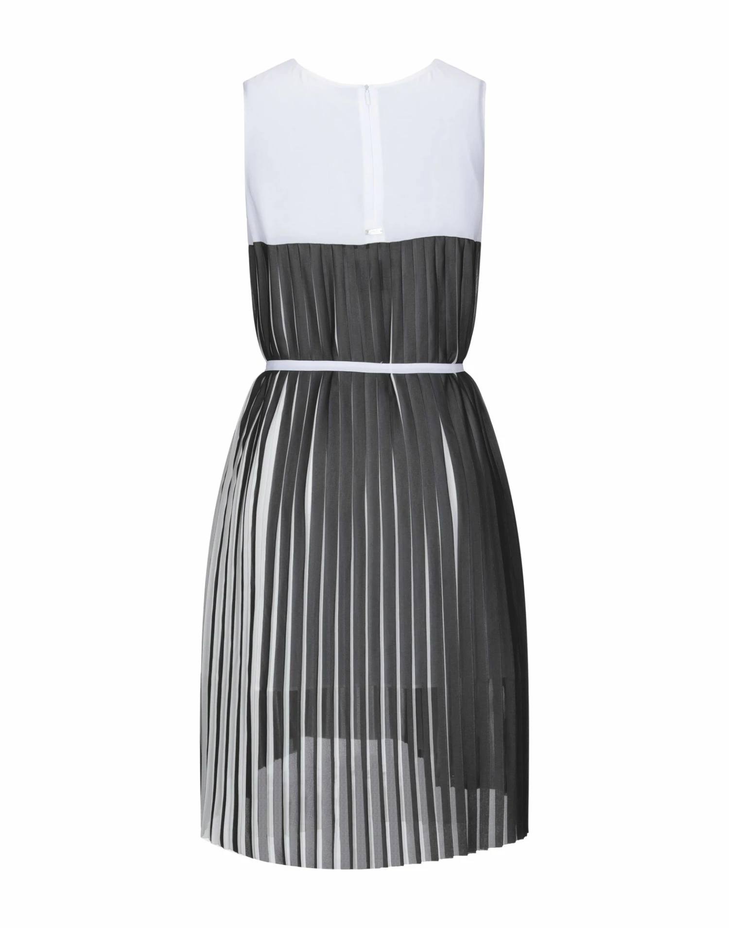 crepe, pleated, sash, two-tone, round collar, sleeveless, no pockets, rear closure, zipper closure, fully lined