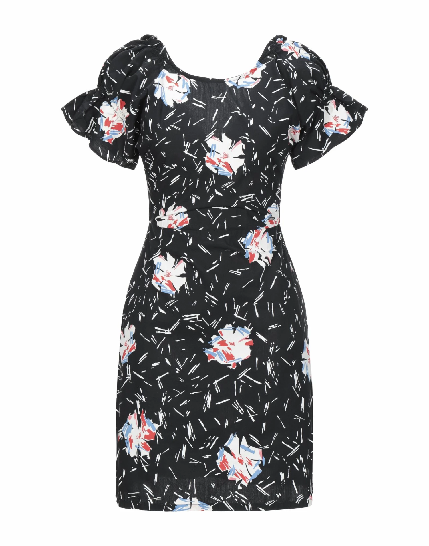 plain weave, logo, floral design, wide neckline, short sleeves, rear closure, zipper closure, unlined