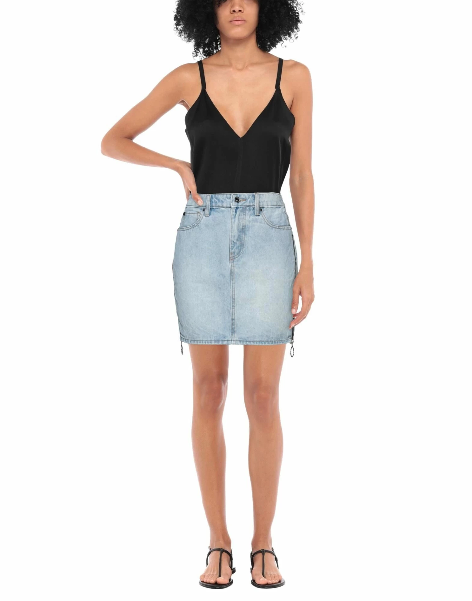 denim, faded, metal applications, brand logo, solid colour with appliqués, light wash, unlined, 1 button, zipper closure, five pockets
