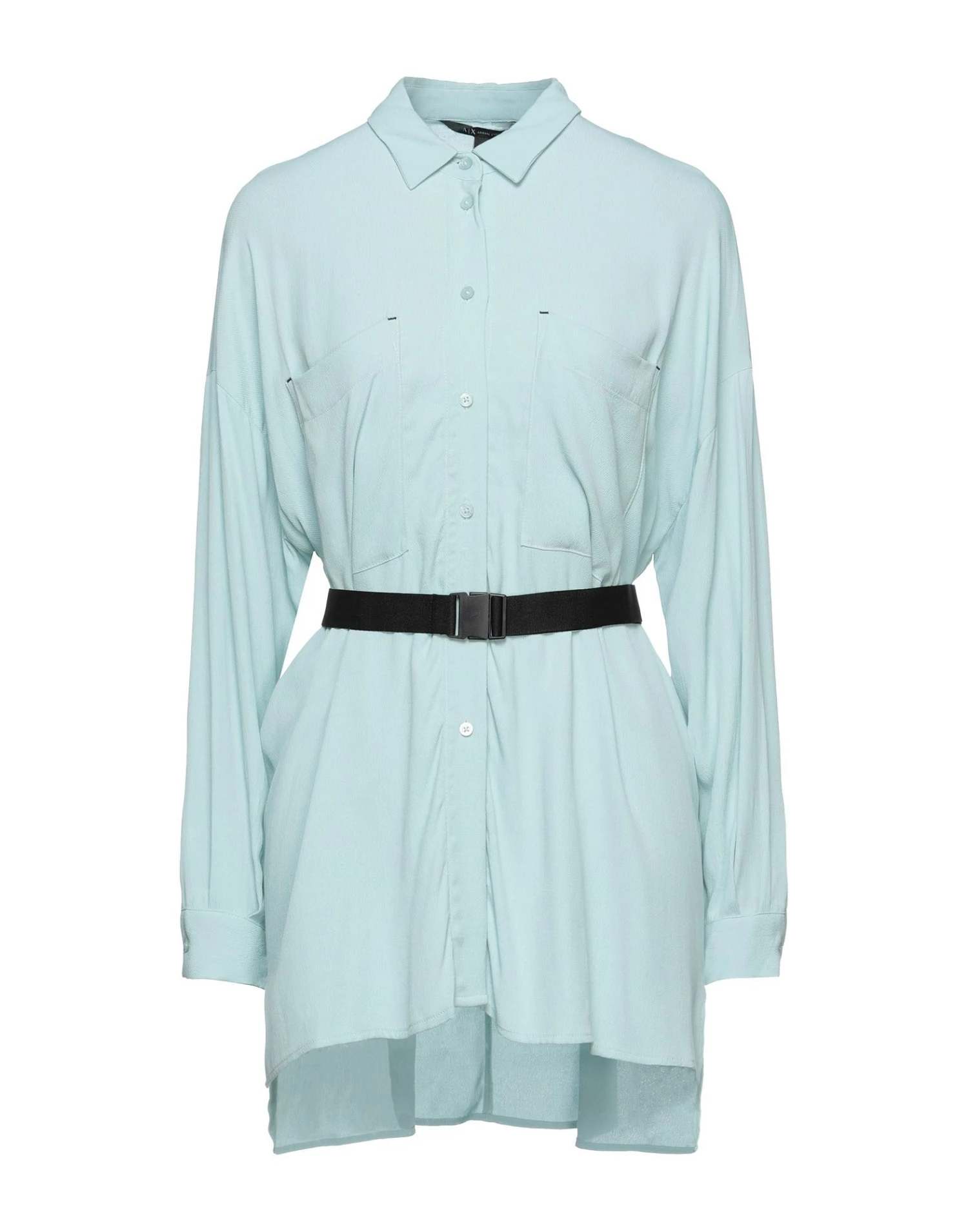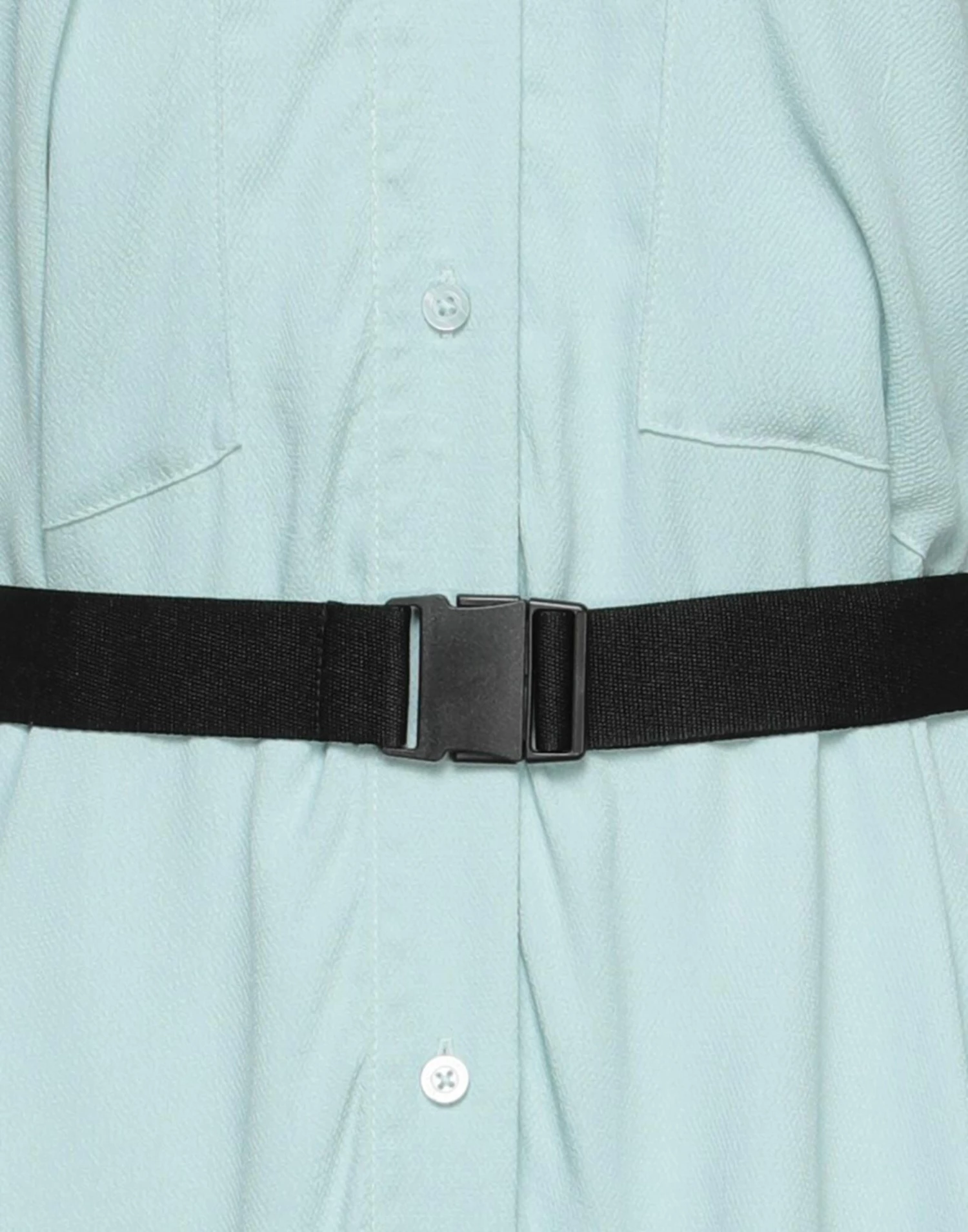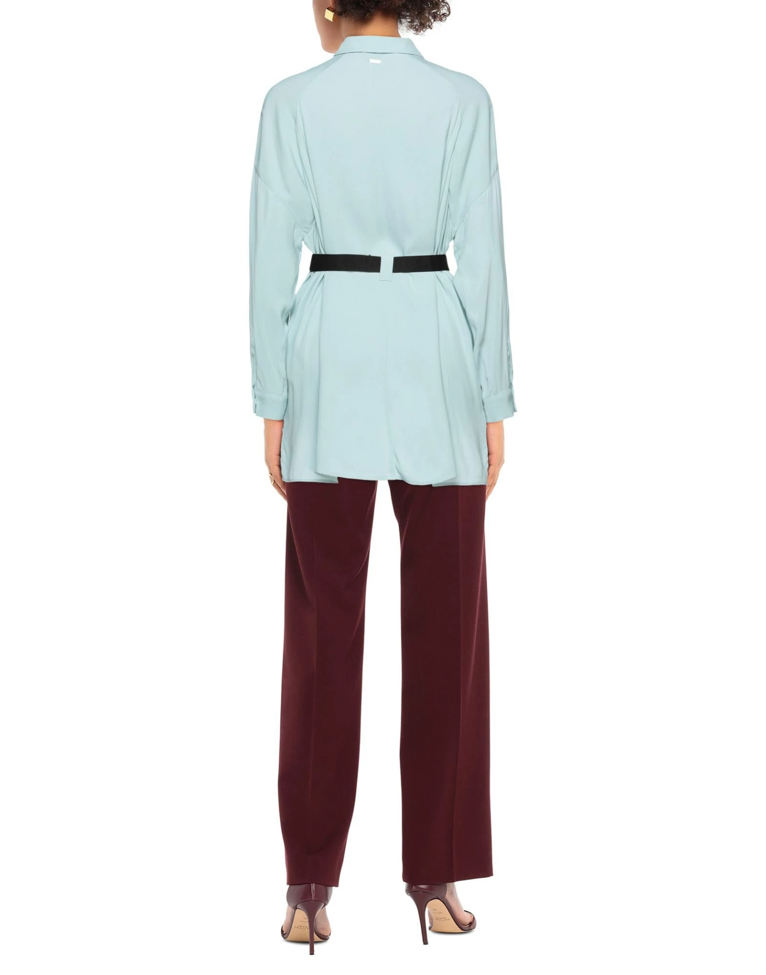 crepe, brand logo, belt, solid color, classic neckline, long sleeves, buttoned cuffs, button closing, two breast pockets